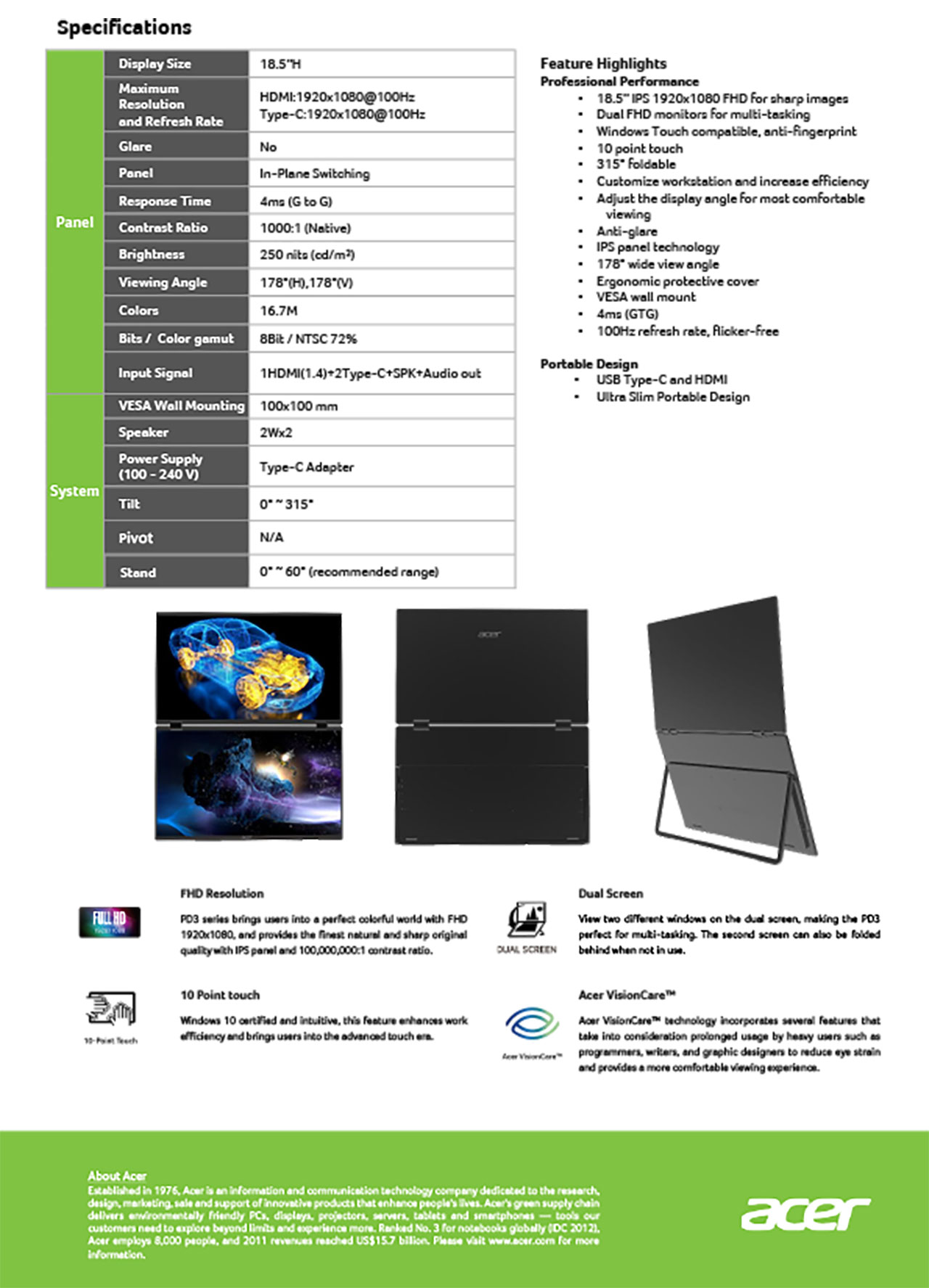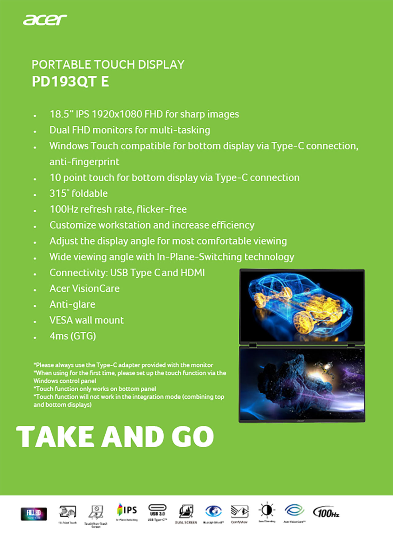 ACER 18.5" FHD MONITOR PD193QT PORTABLE (DUAL) TOUCH