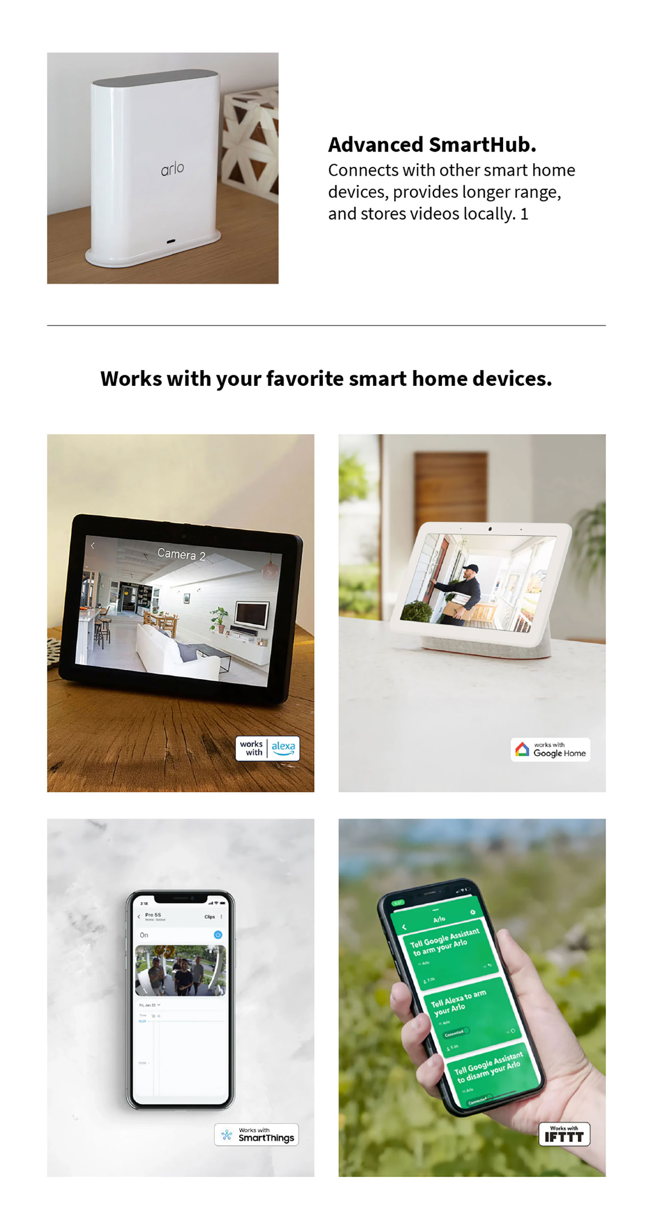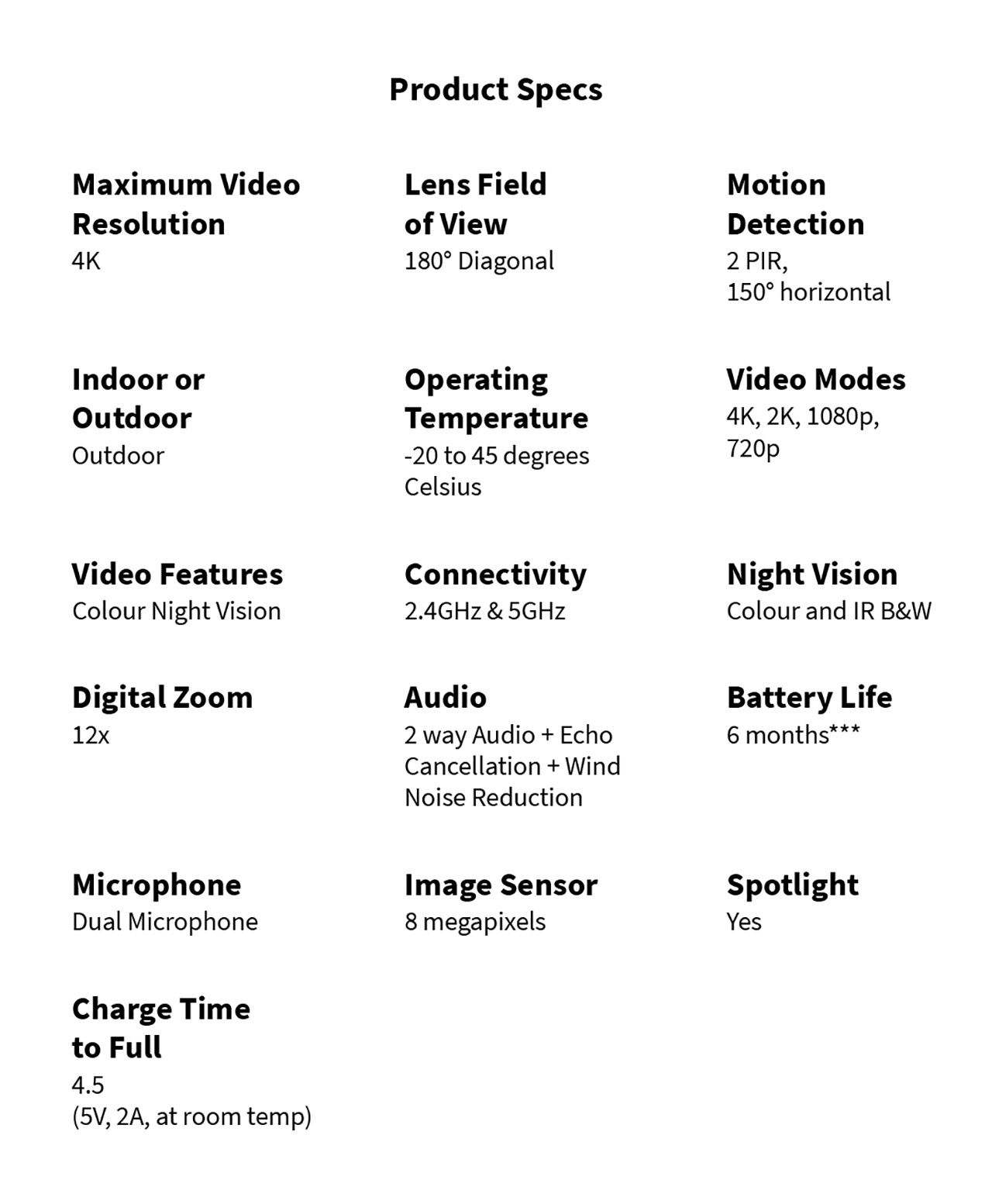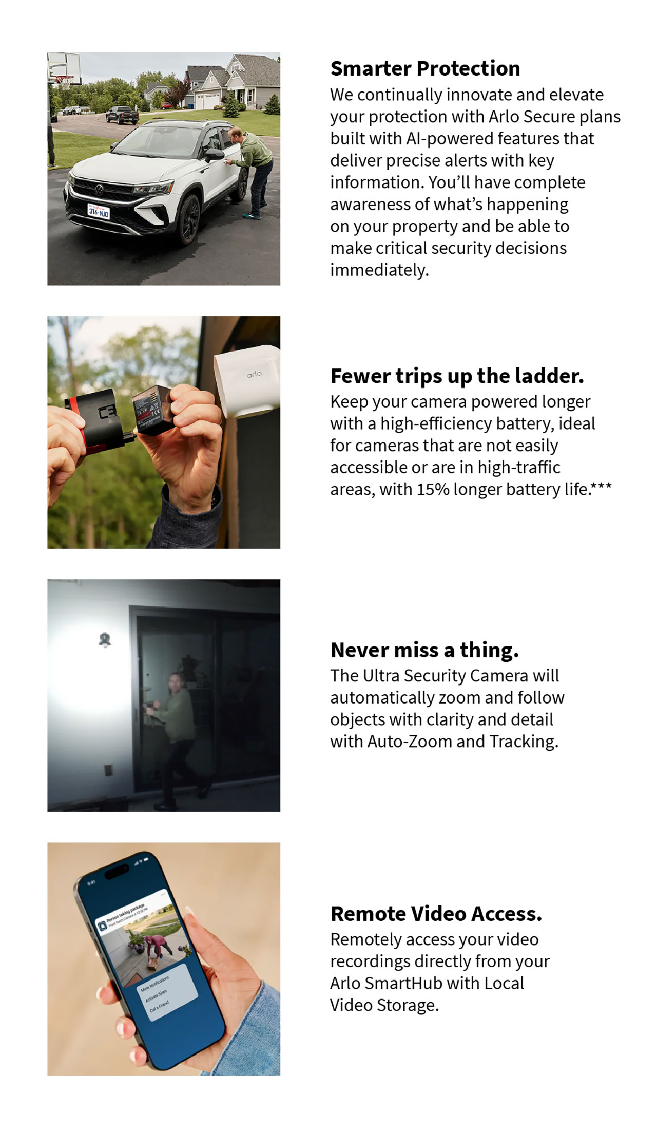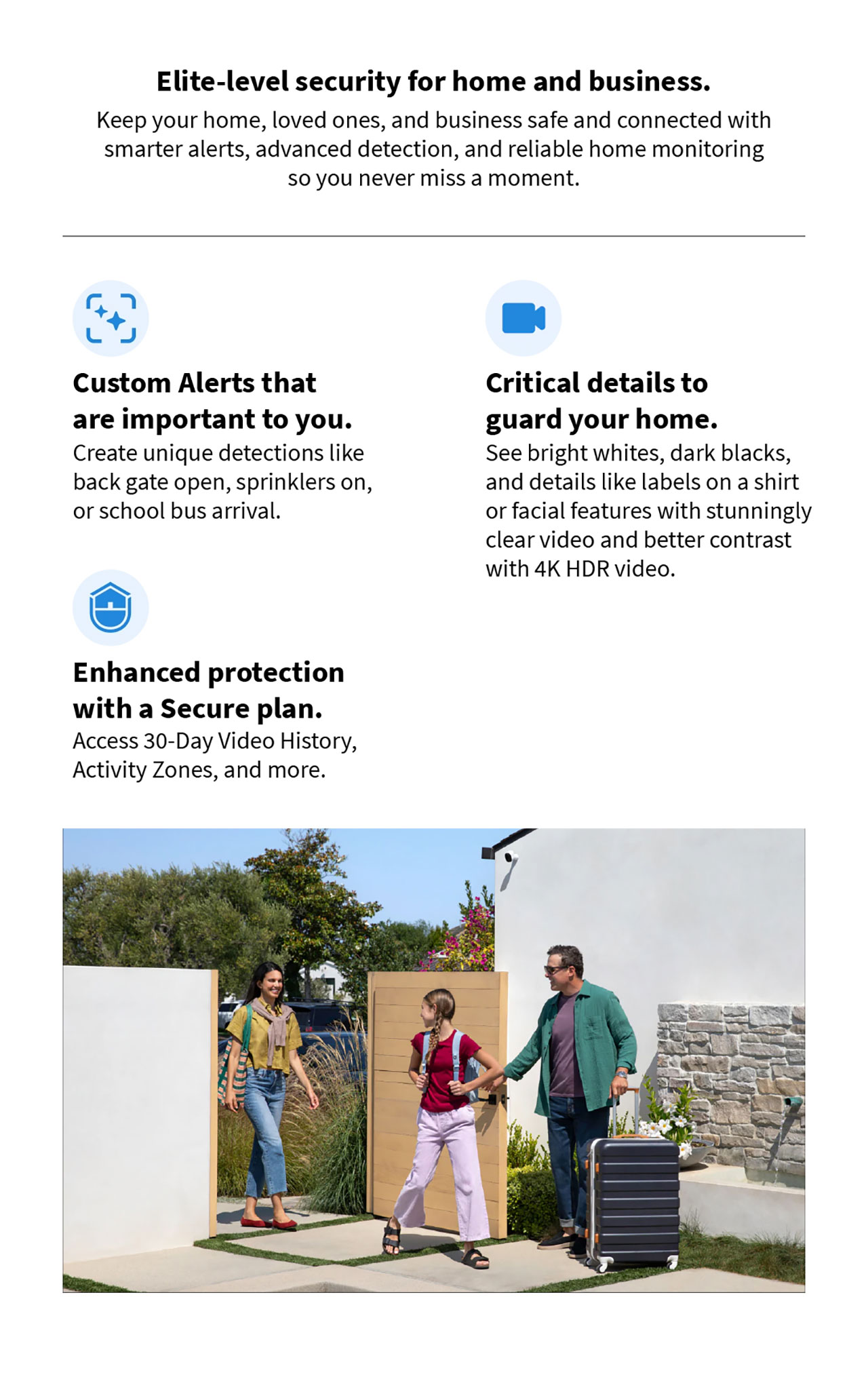 Get sharp 4K HDR video with Auto-Zoom and Tracking, a 180° Field of View, and enhanced Color Night Vision for clarity day or night to protect your home and loved ones. Smart Detection notifies you of people, vehicles, and packages, while the built-in spotlight deters intruders putting complete control at your fingertips in the Arlo Secure App. (SmartHub required).