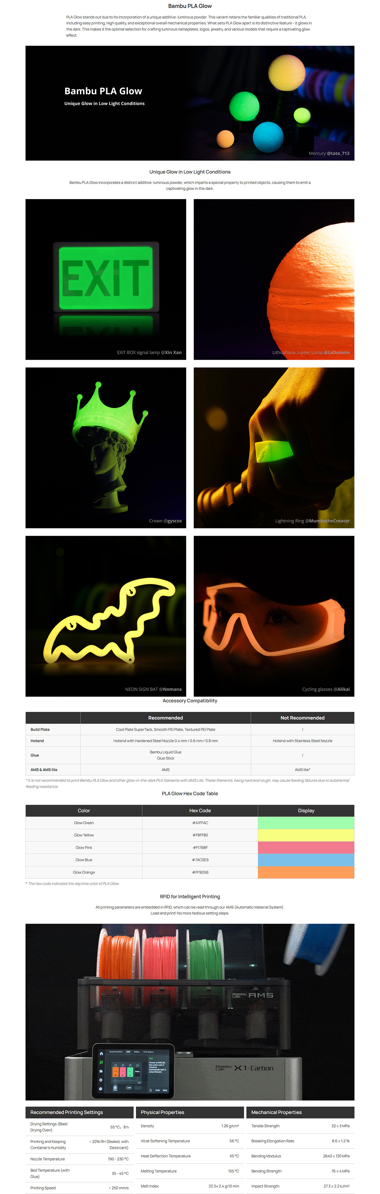 PLA Glow stands out due to its incorporation of a unique additive: luminous powder. This variant retains the familiar qualities of traditional PLA, including easy printing, high quality, and exceptional overall mechanical properties. What sets PLA Glow apart is its distinctive feature - it glows in the dark. This makes it the optimal selection for crafting luminous nameplates, logos, jewelry, and various models that require a captivating glow effect.