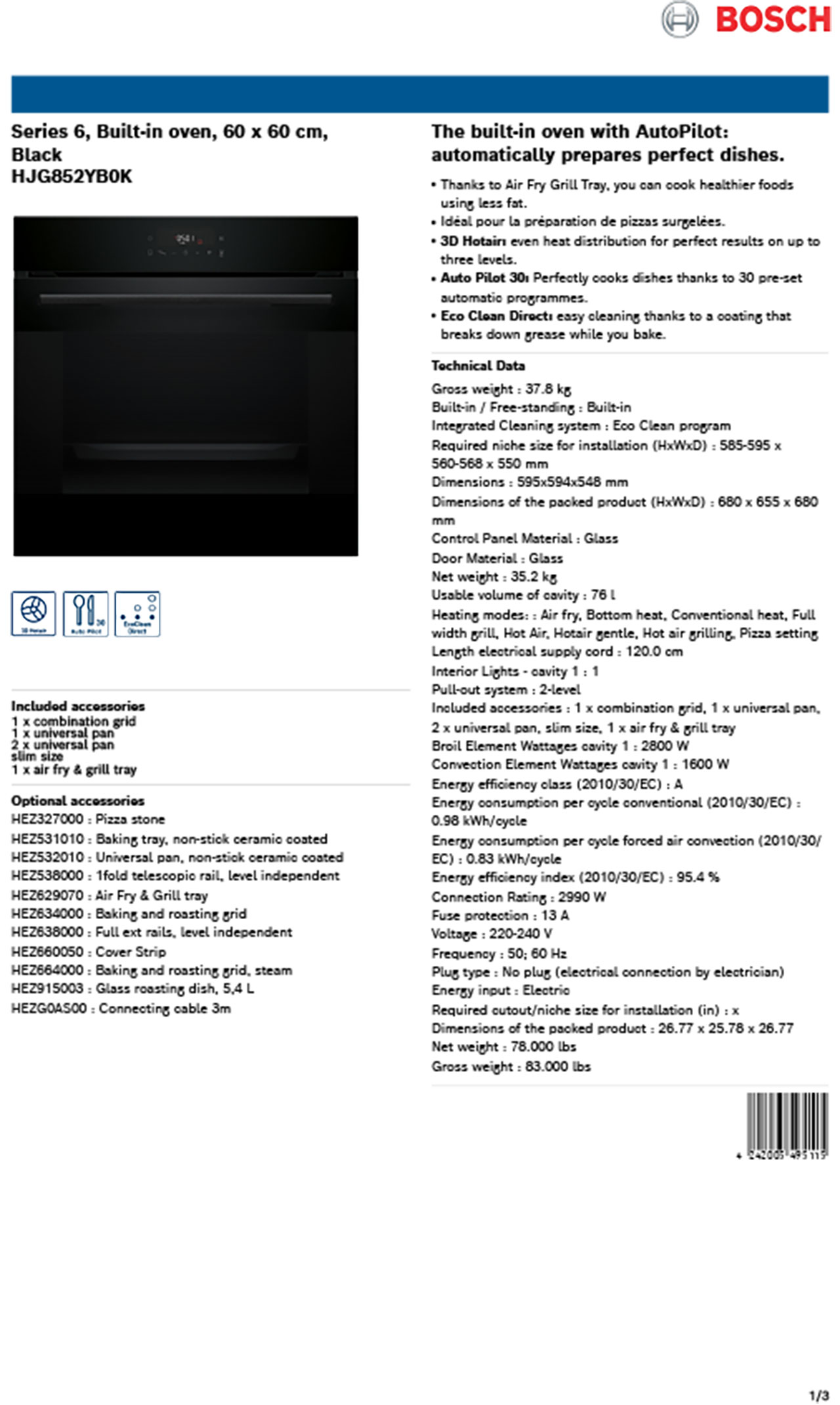 BOSCH BUILT IN OVEN-76L HJG852YB0K