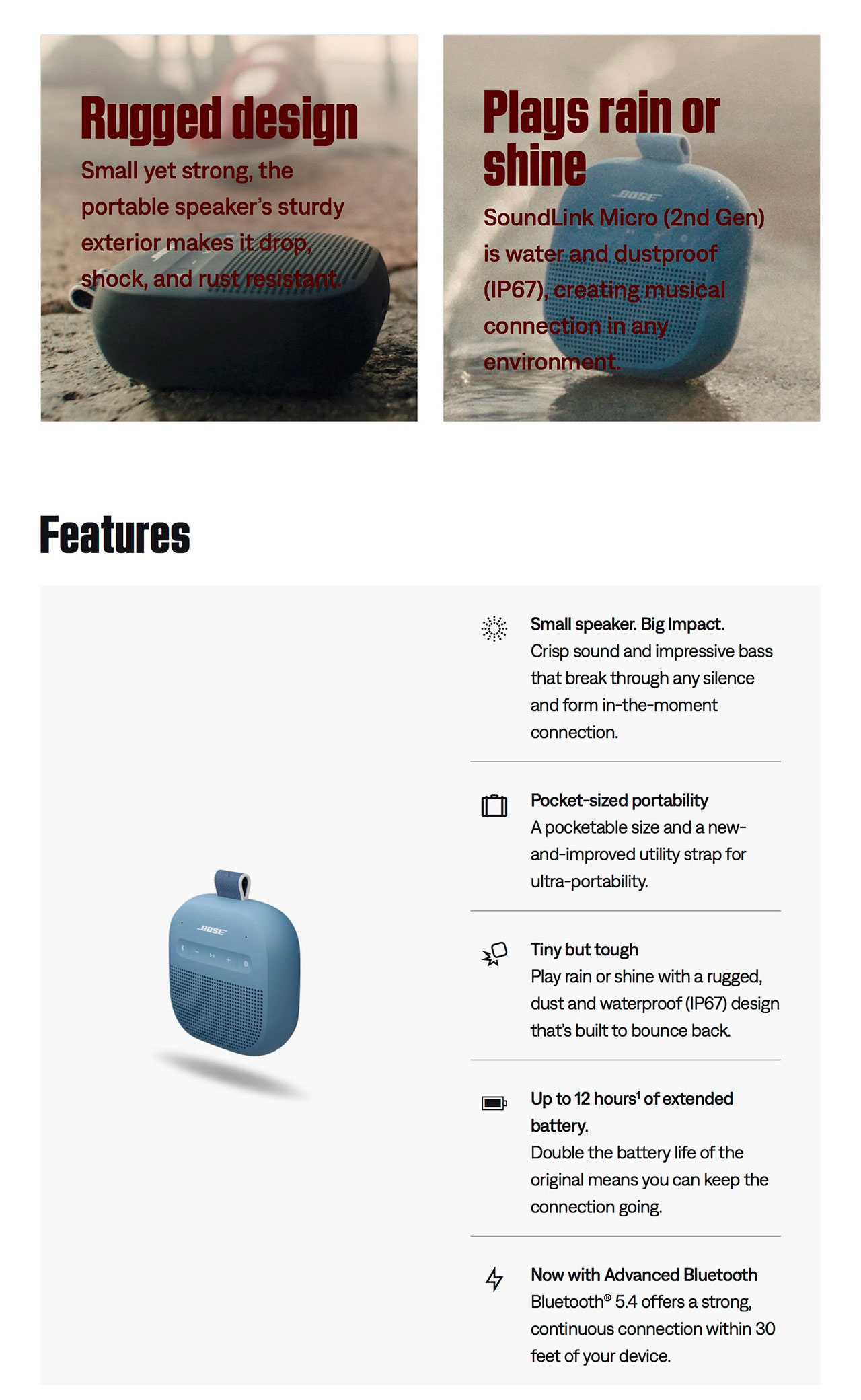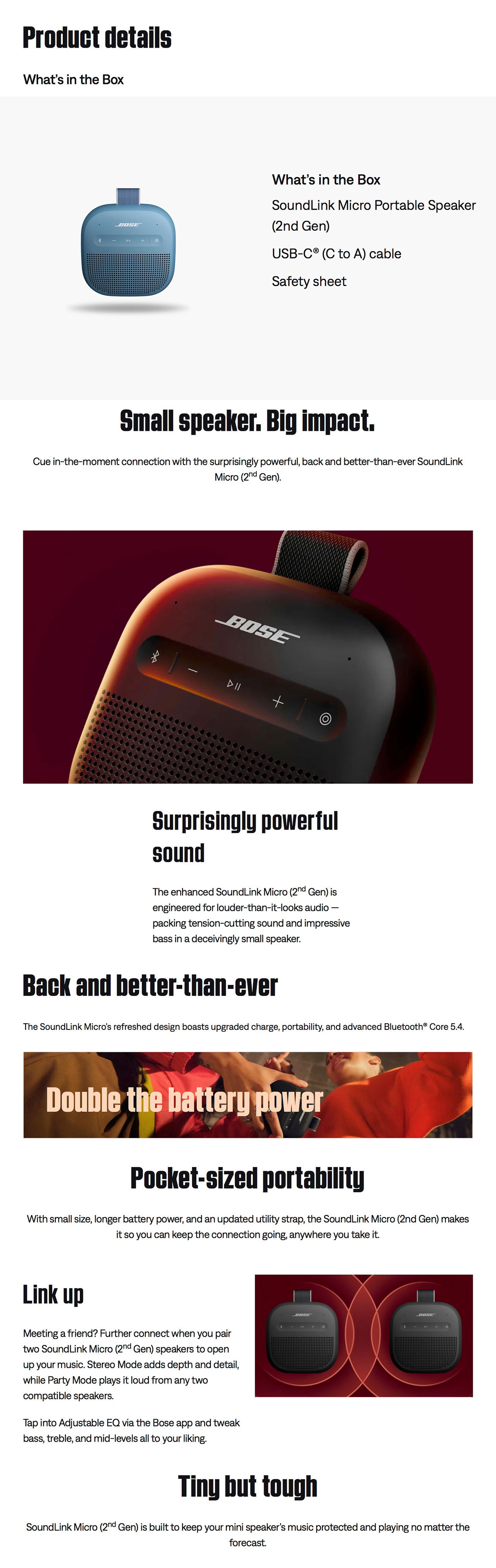 The Bose SoundLink Micro (Gen 2) Wireless Speaker in Petal Pink delivers powerful, balanced audio in a rugged, ultra-compact design. Built for life on the go, it connects wirelessly via Bluetooth to your smartphone, tablet or other devices and produces clear, rich sound that defies its size. With a waterproof exterior and tear-resistant strap, this speaker is ready for outdoor adventures, workouts, pool days or everyday listening.