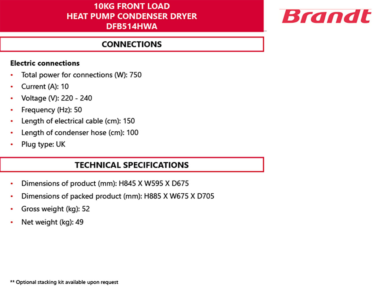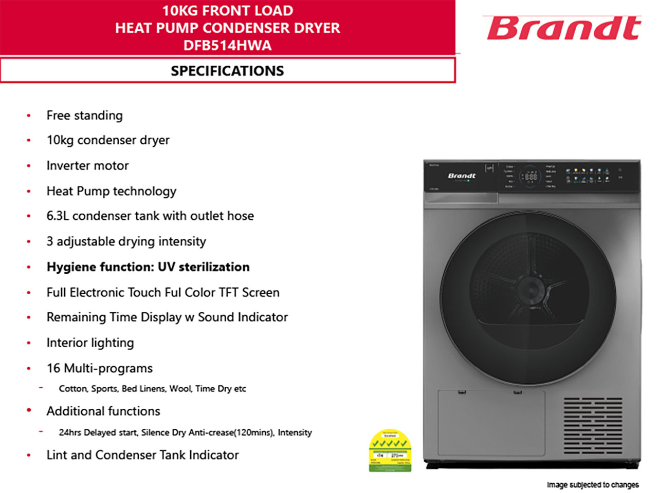 BRANDT HEAT PUMP DRYER DFB514HWA