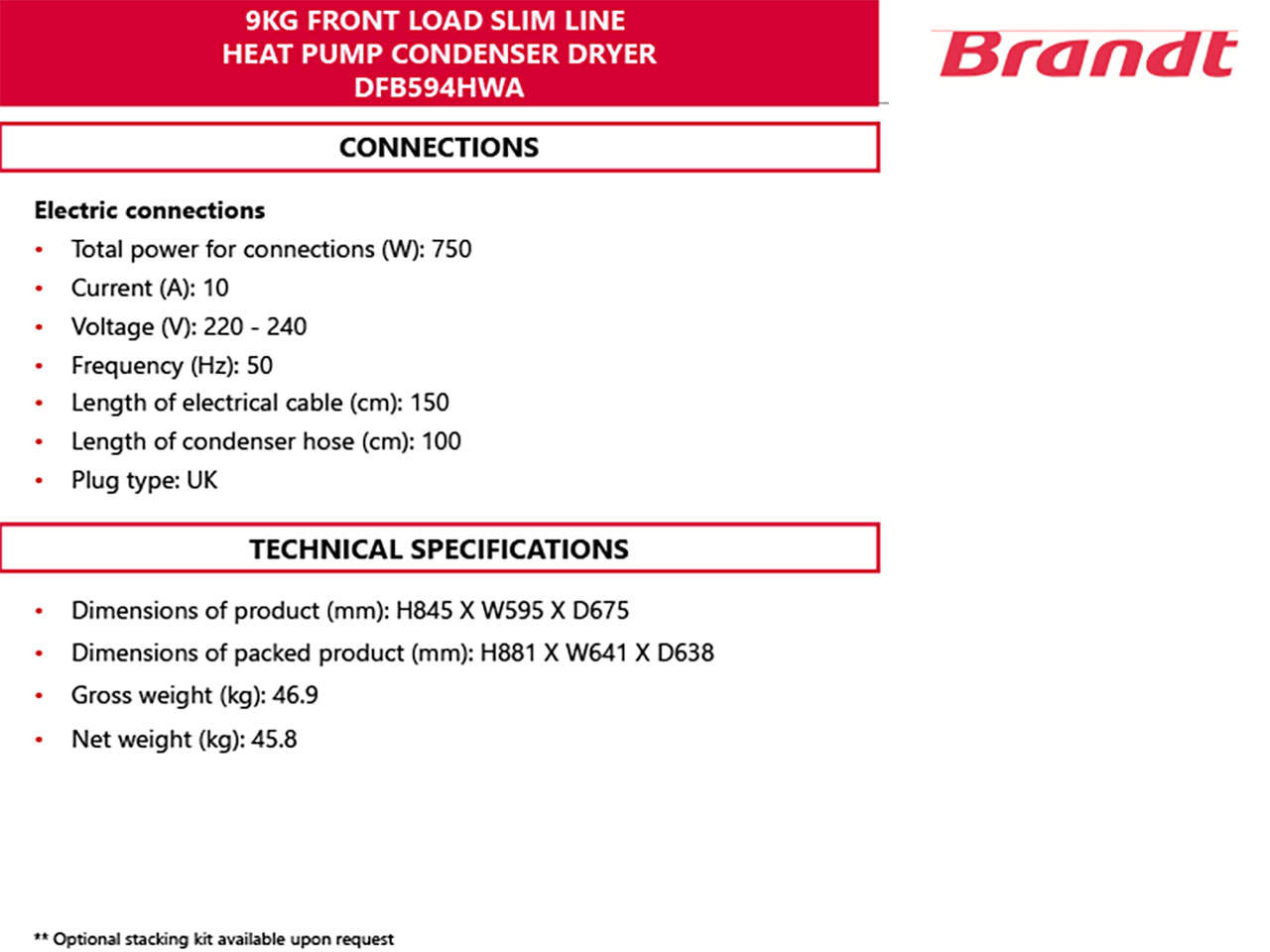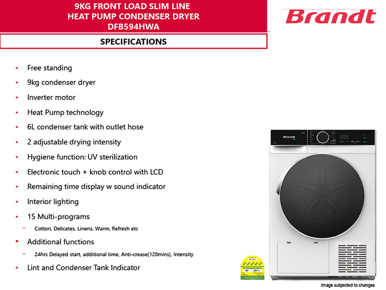 BRANDT HEAT PUMP DRYER DFB594HWA