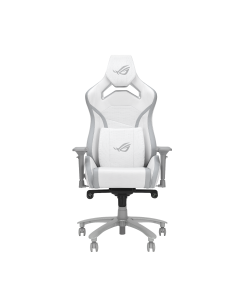 ROG Chariot X Core gaming chair in racing-car style, featuring an adjustable high-density foam headrest, memory-foam lumbar support, 4D armrests, tilt mechanism, durable class 4 gas lift, and durable premium PU leather for a premium gaming experience.