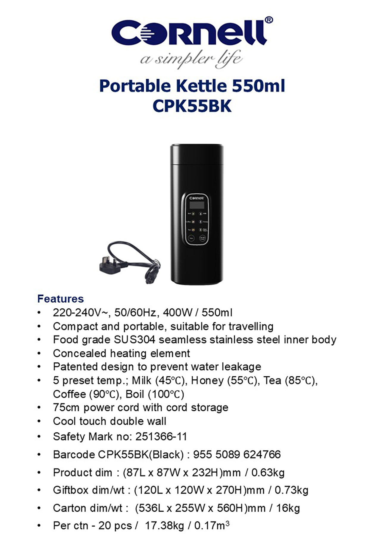 CORNELL PORTABLE KETTLE 550ML CPK55BK