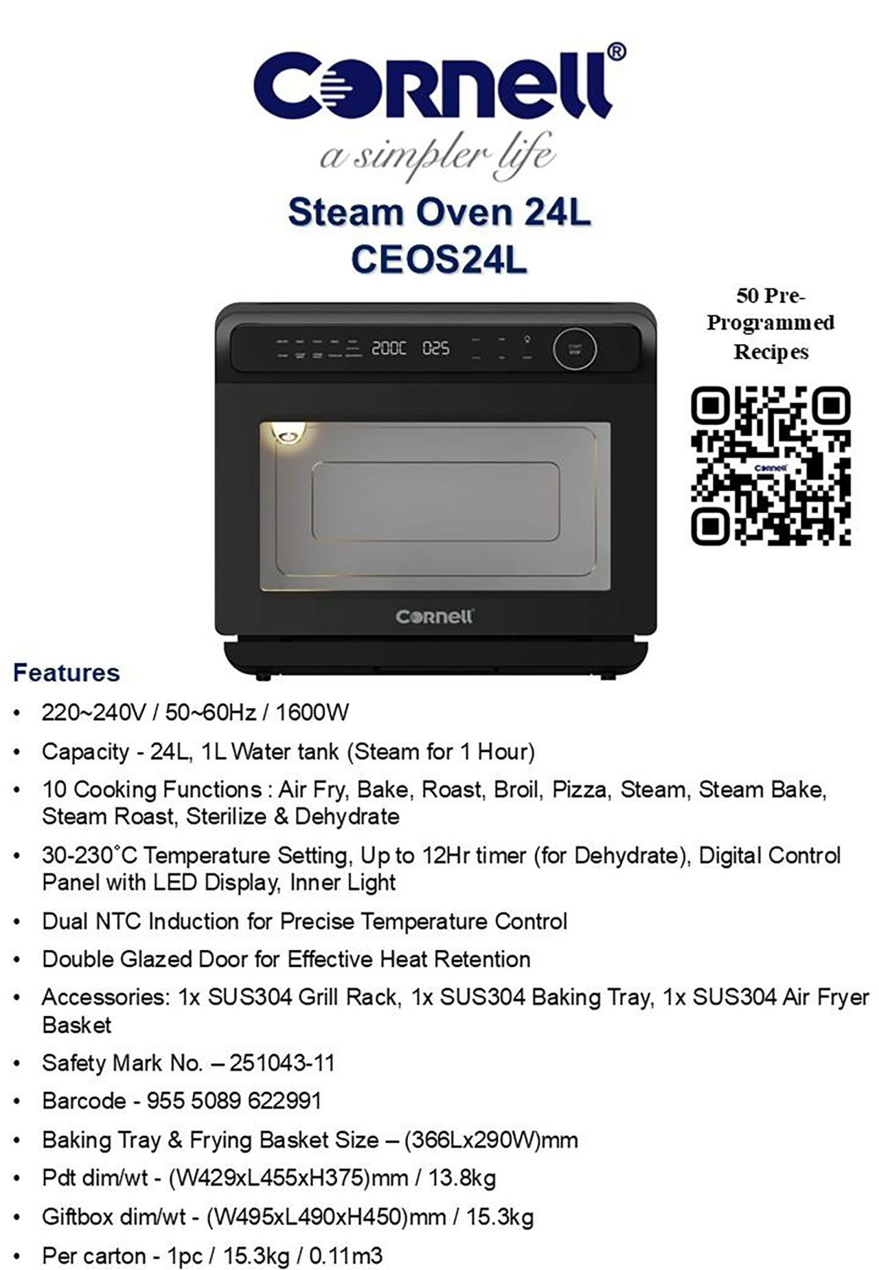 The Cornell 24L Steam Oven (CEOS24L) is a 1600W multifunctional countertop appliance that combines steam, air frying, and convection cooking. It features 10 pre-programmed functions and a 1-litre water tank that provides up to one hour of continuous steam.