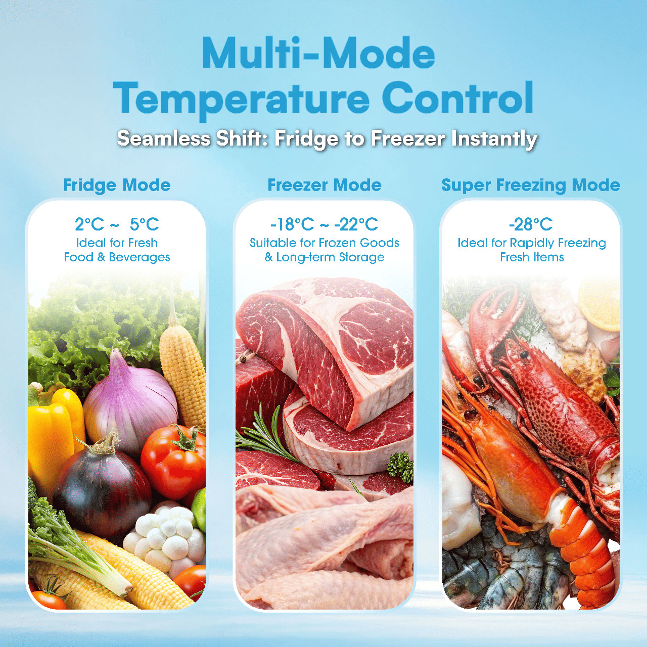 2-in-1 Freezer & Fridge: Switch easily between fridge (2–5°C) and freezer (-18 to -22°C) modes.
