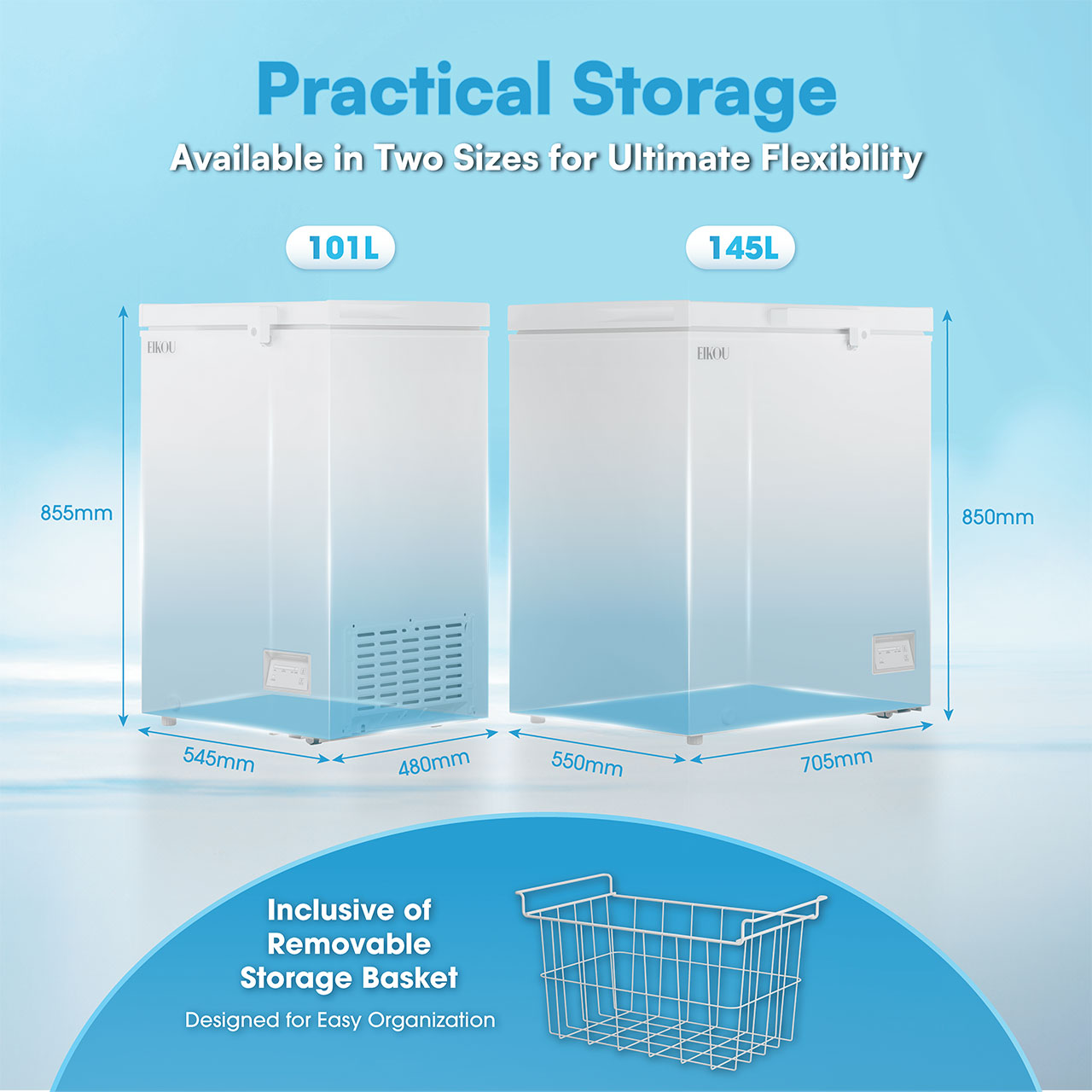 The Eikou Chest Freezer EIK-1-101 is a versatile storage solution for households that need extra refrigeration space. With 2-in-1 freezer and fridge functionality, electronic temperature control, and convenient storage features, it ensures optimal food preservation while making access and organization effortless.