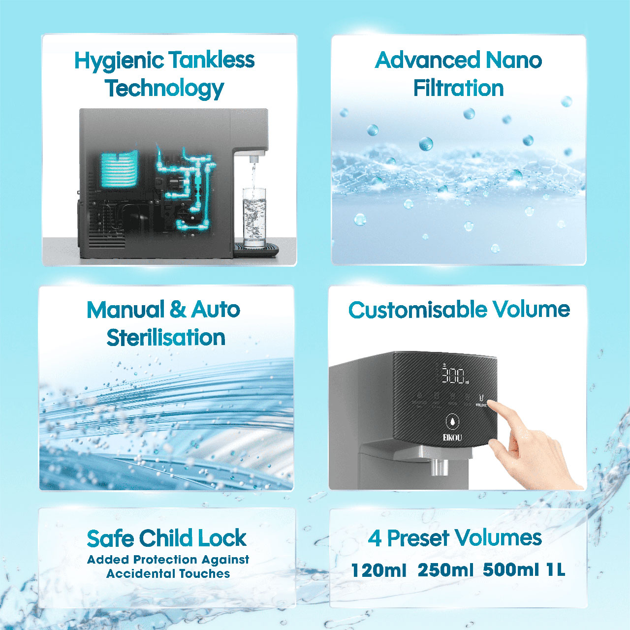 - Auto Sterilisation Mode: Ensures hygiene by automatically sterilizing the water dispenser.