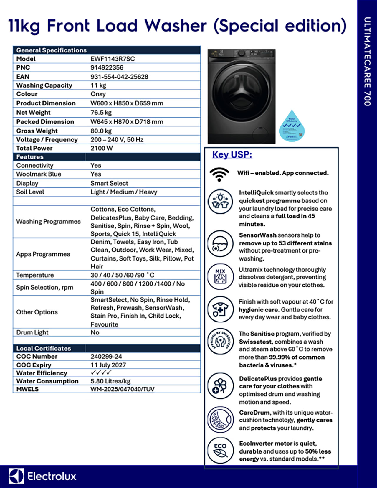 ELECTROLUX FRONT LOAD WASHER (SPECIAL EDITION) EWF1143R7SC- SPECIAL EDITION