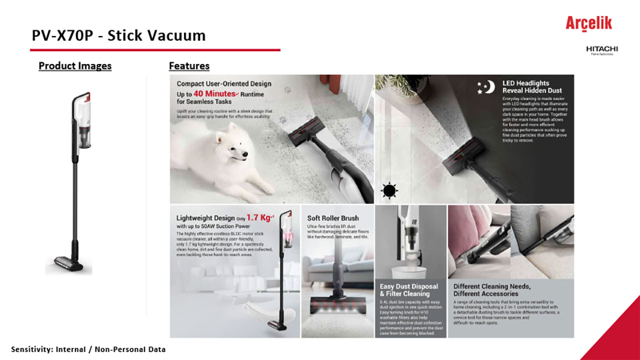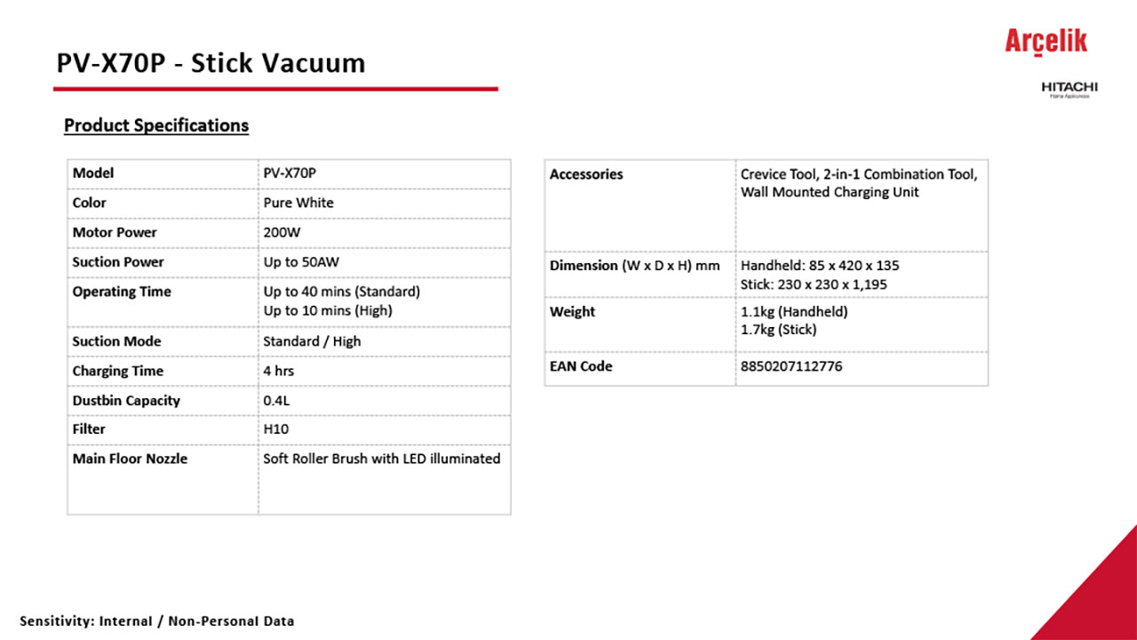 The Hitachi PV-X70P is a 200W cordless stick vacuum cleaner designed for lightweight, everyday home maintenance. It is particularly noted for its 1.7kg build and soft roller brush, making it ideal for delicate hard floors like hardwood or laminate.