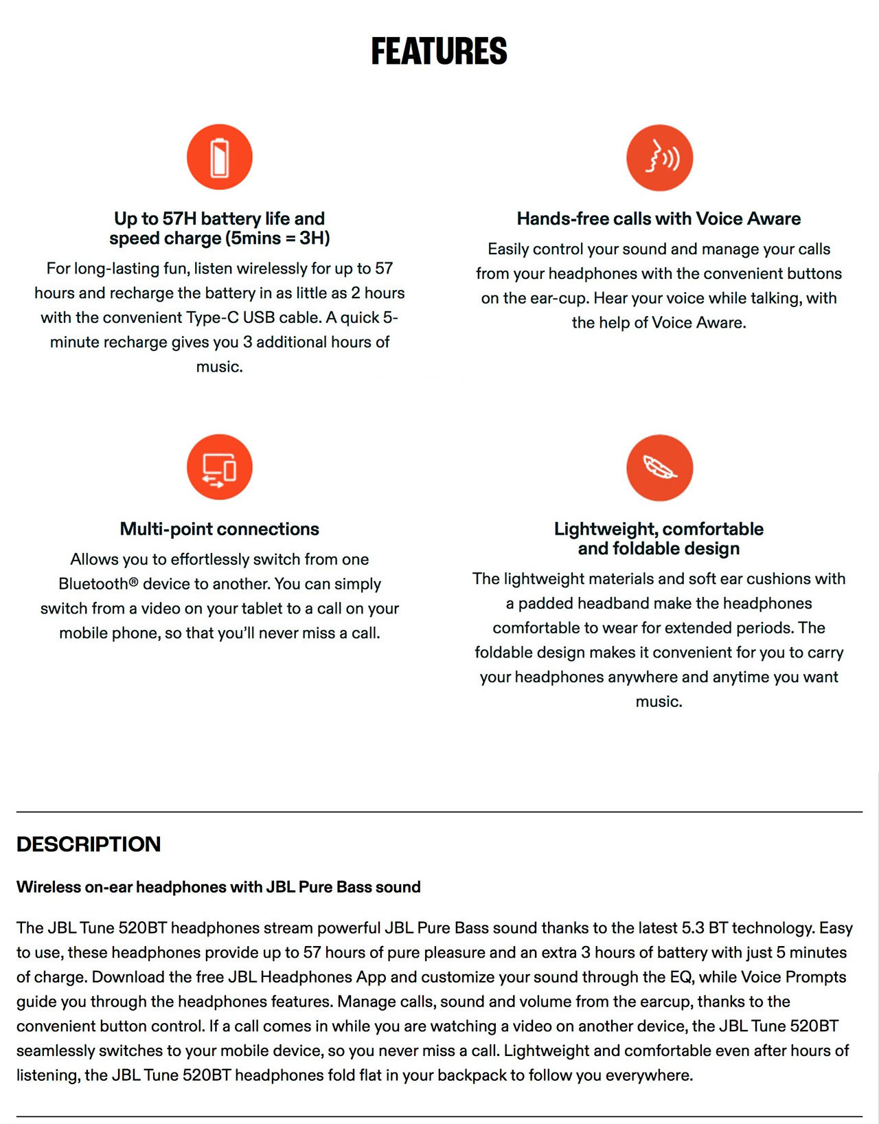 JBL TUNE 520 WIRELESS HEADSET - BLACK JBL-HPS-T520BT BLK