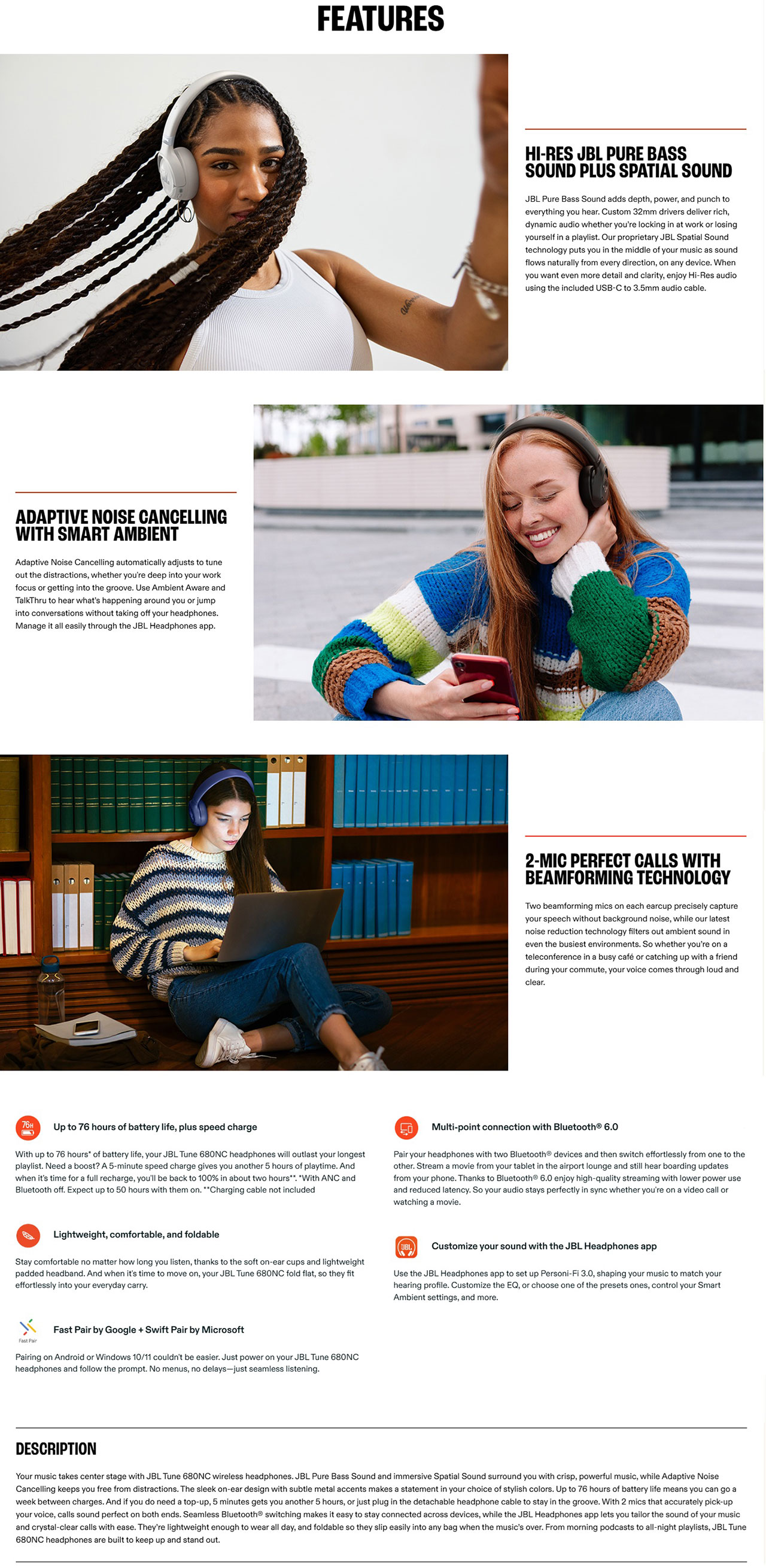 The JBL Tune 680NC (model JBL-HPS-T680NC) is a wireless on-ear headset. It is a successor to the JBL Tune 670NC and introduces updated features like Bluetooth 6.0 and improved fast charging.