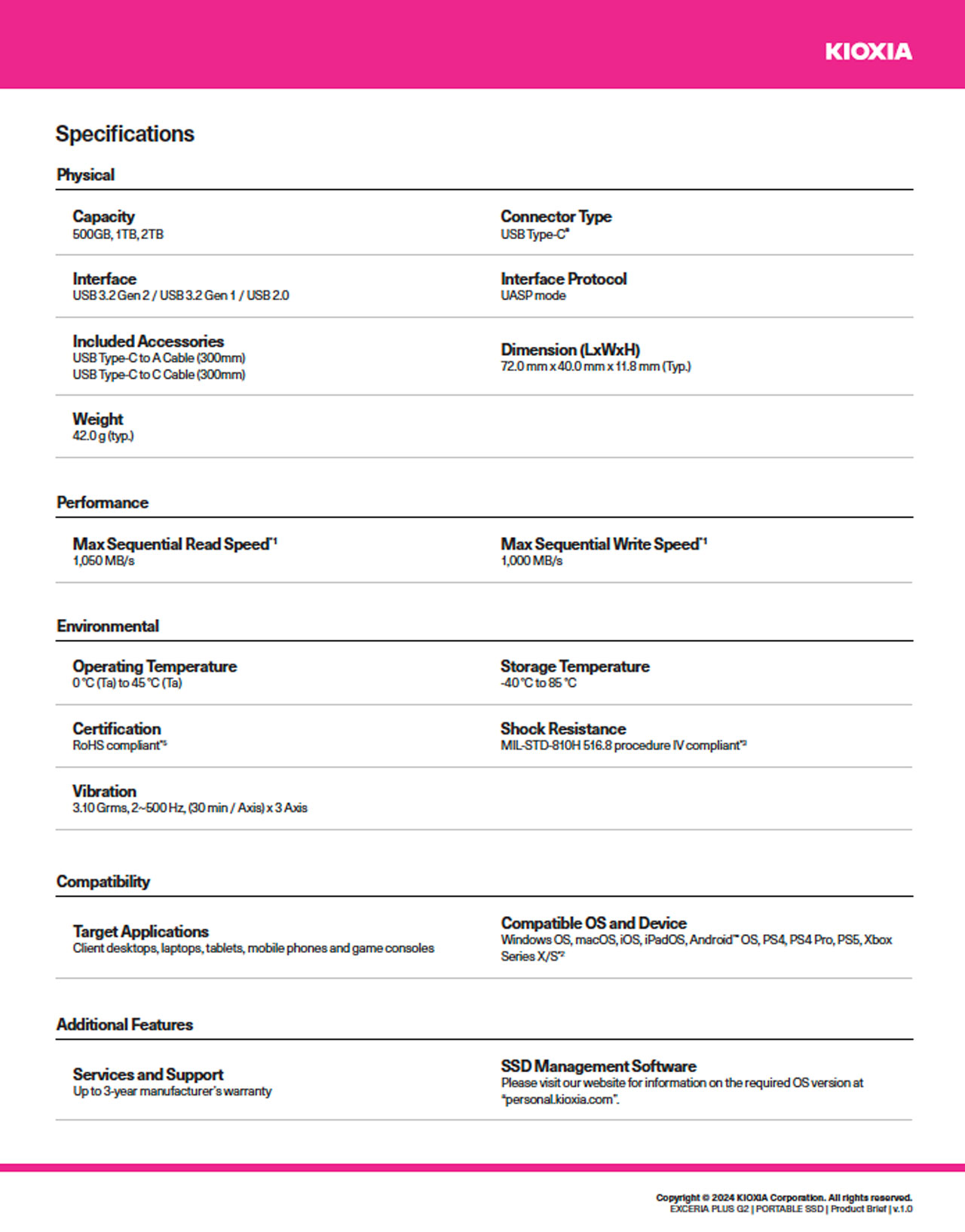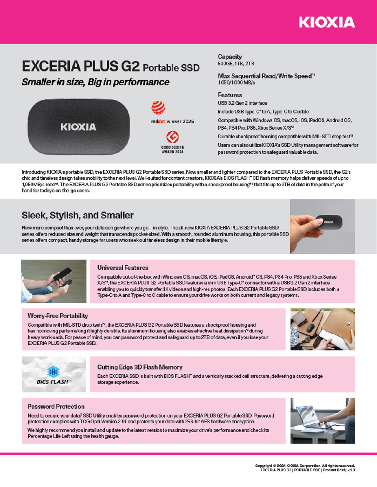 KIOXIA EXCERIA PLUS G2 500GB PORTABLE SSD LXD20K500GG8