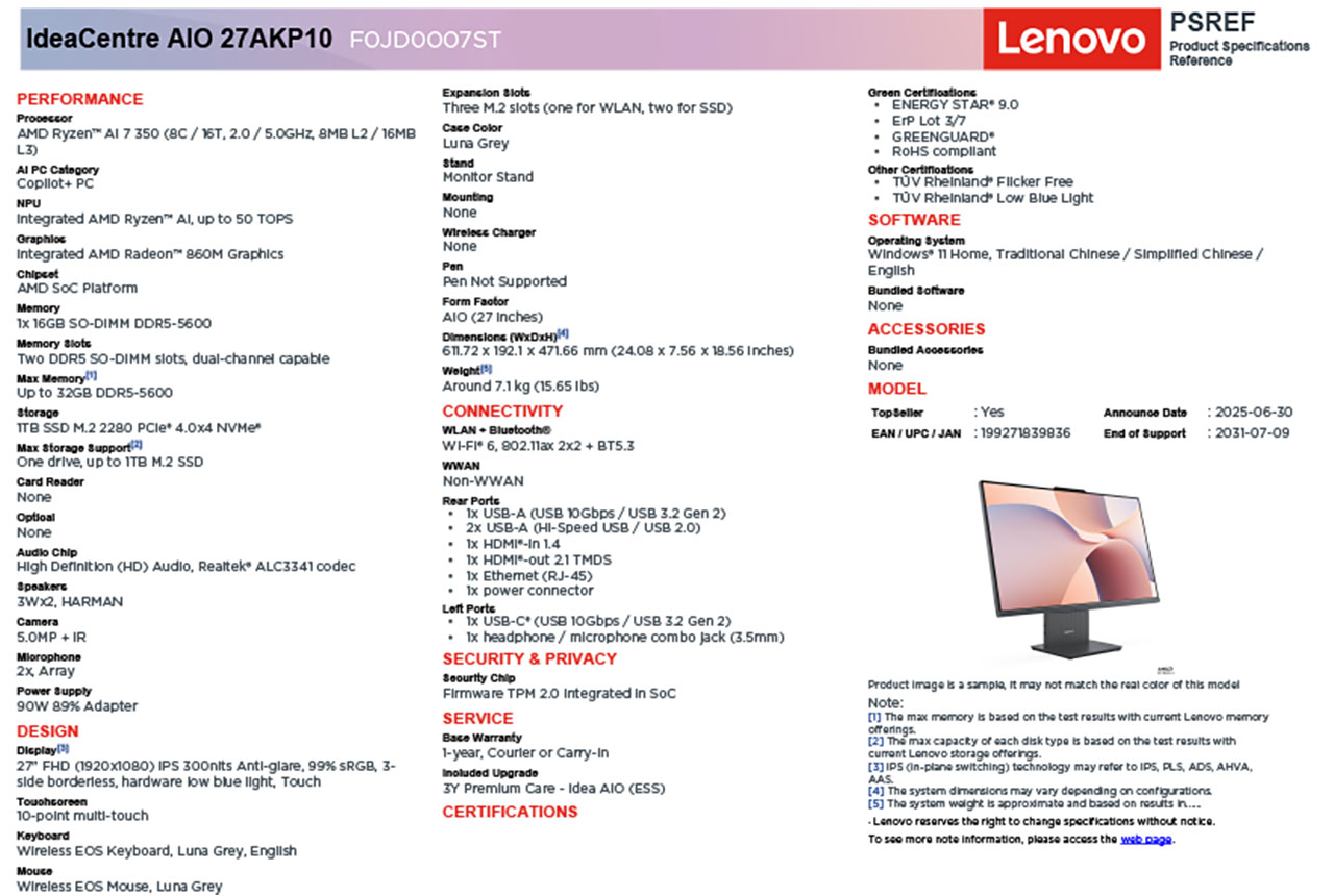 LENOVO IDEACENTRE AIO 27" RYZEN AI 7 350 F0JD0007ST