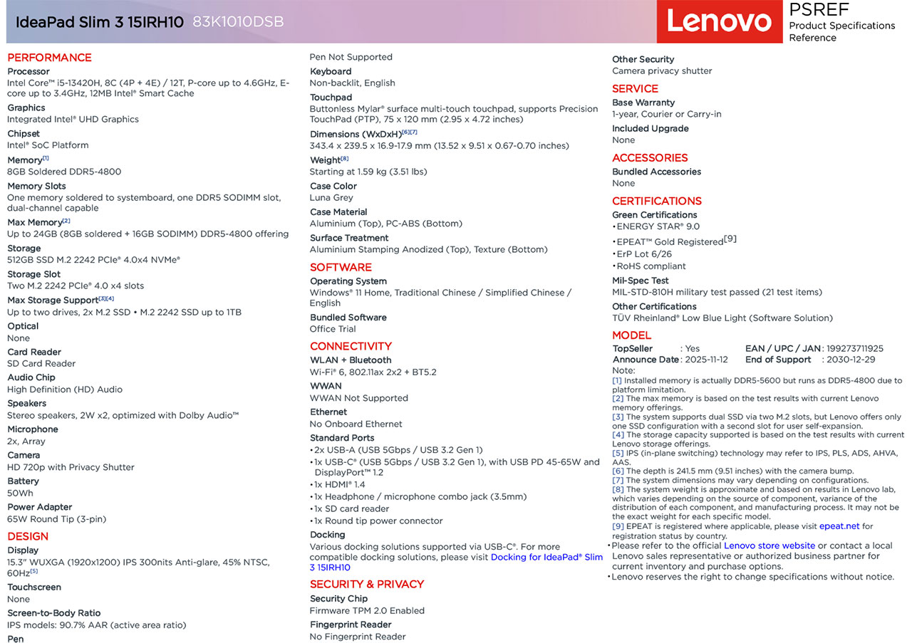 - Memory: 8GB soldered DDR5-4800 RAM. According to Lenovo PSREF for the 15IRH10 series, there is typically one SO-DIMM slot allowing for upgrades up to 24GB total (8GB soldered + 16GB SO-DIMM).