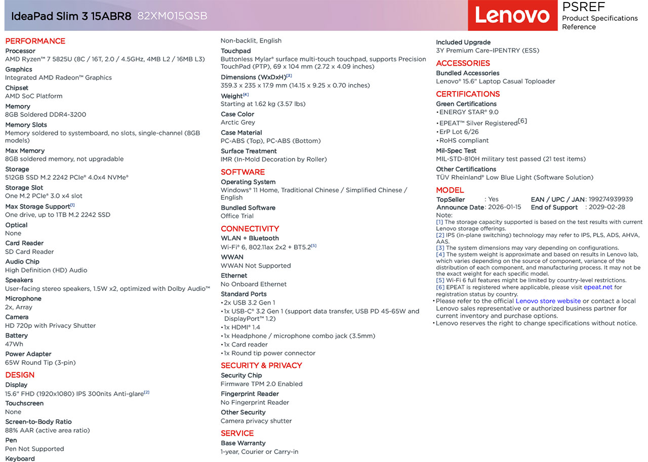 The Lenovo IdeaPad Slim 3 15.6" (model 82XM015QSB) is a performance-oriented budget laptop featuring an 8-core AMD Ryzen 7 5825U processor.