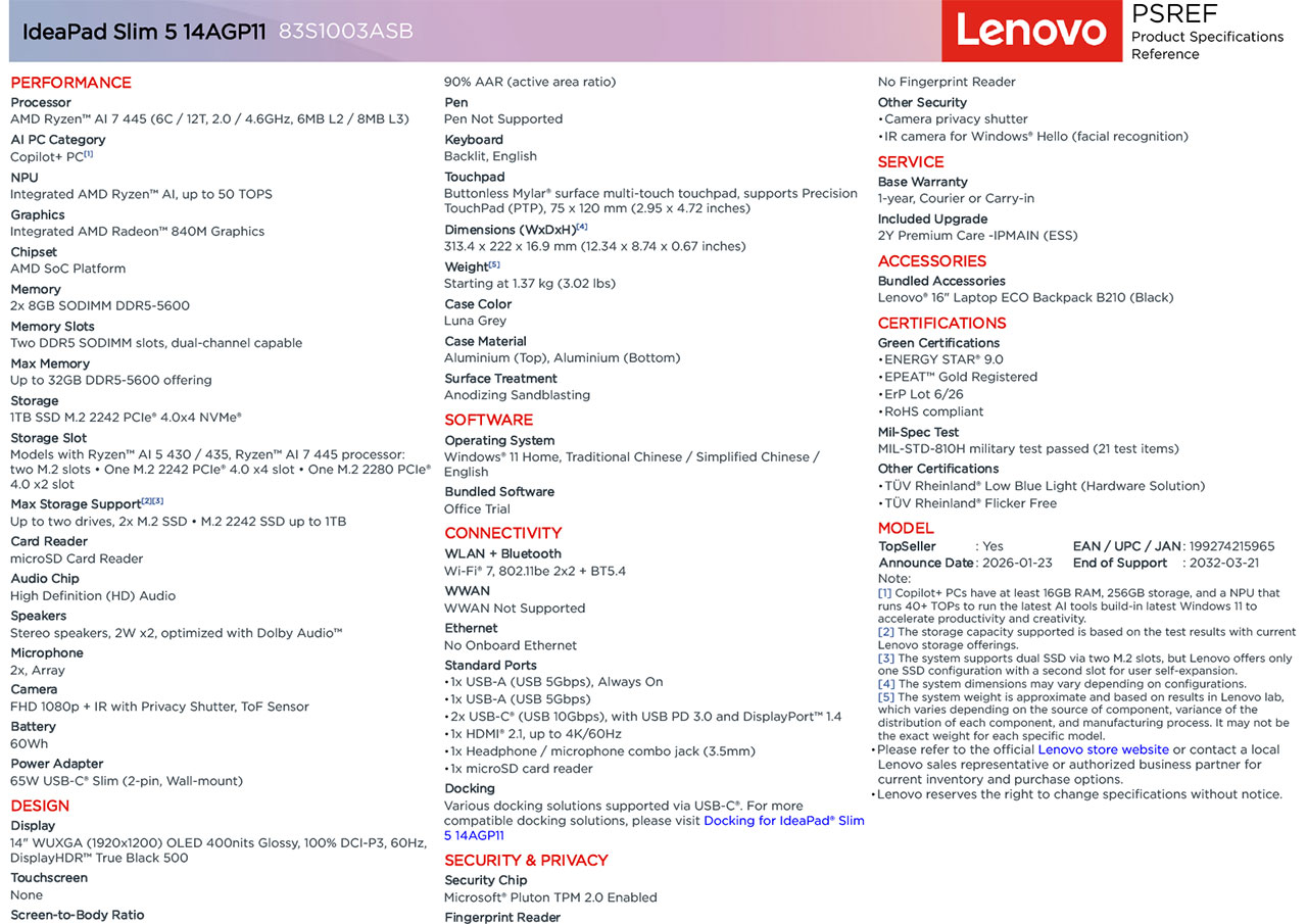 83S1003ASB) is a "Copilot+ PC" that features the latest AMD Ryzen AI 7 445 processor. This model is designed for users needing high-performance AI acceleration in a portable 14-inch form factor, featuring a premium OLED display and 1TB of storage.