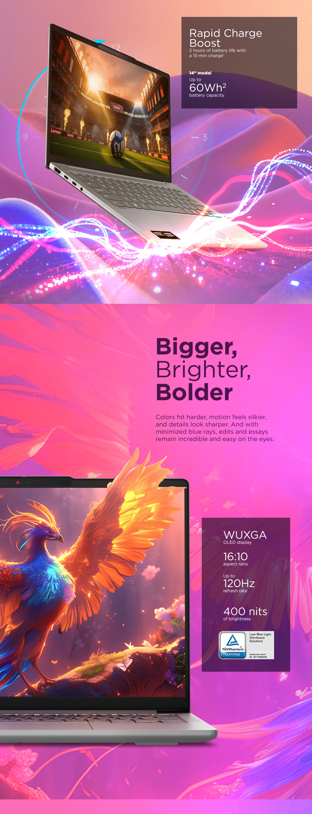 - Visual Features: 100% DCI-P3 color gamut, 400 nits typical brightness, and TÜV Rheinland Low Blue Light certification.