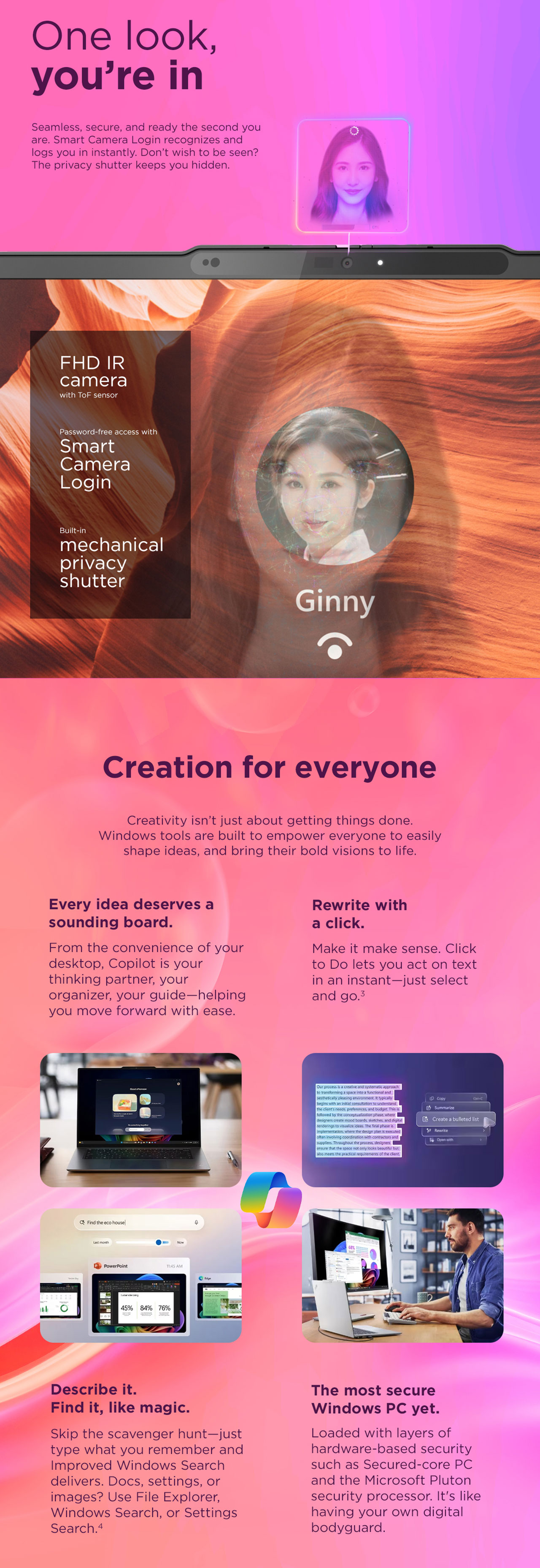 - Camera: FHD 1080p + IR camera with privacy shutter, supporting secure login via Windows Hello.