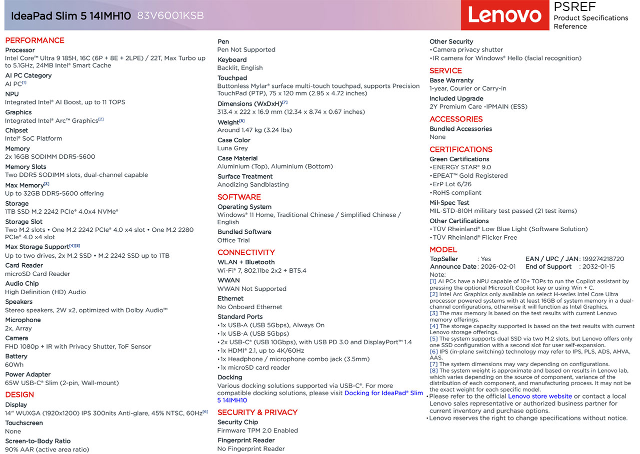 The Lenovo IdeaPad Slim 5 14IMH10 (83V6001KSB) is a 14-inch performance-oriented laptop featuring the high-end Intel Core Ultra 9 processor.