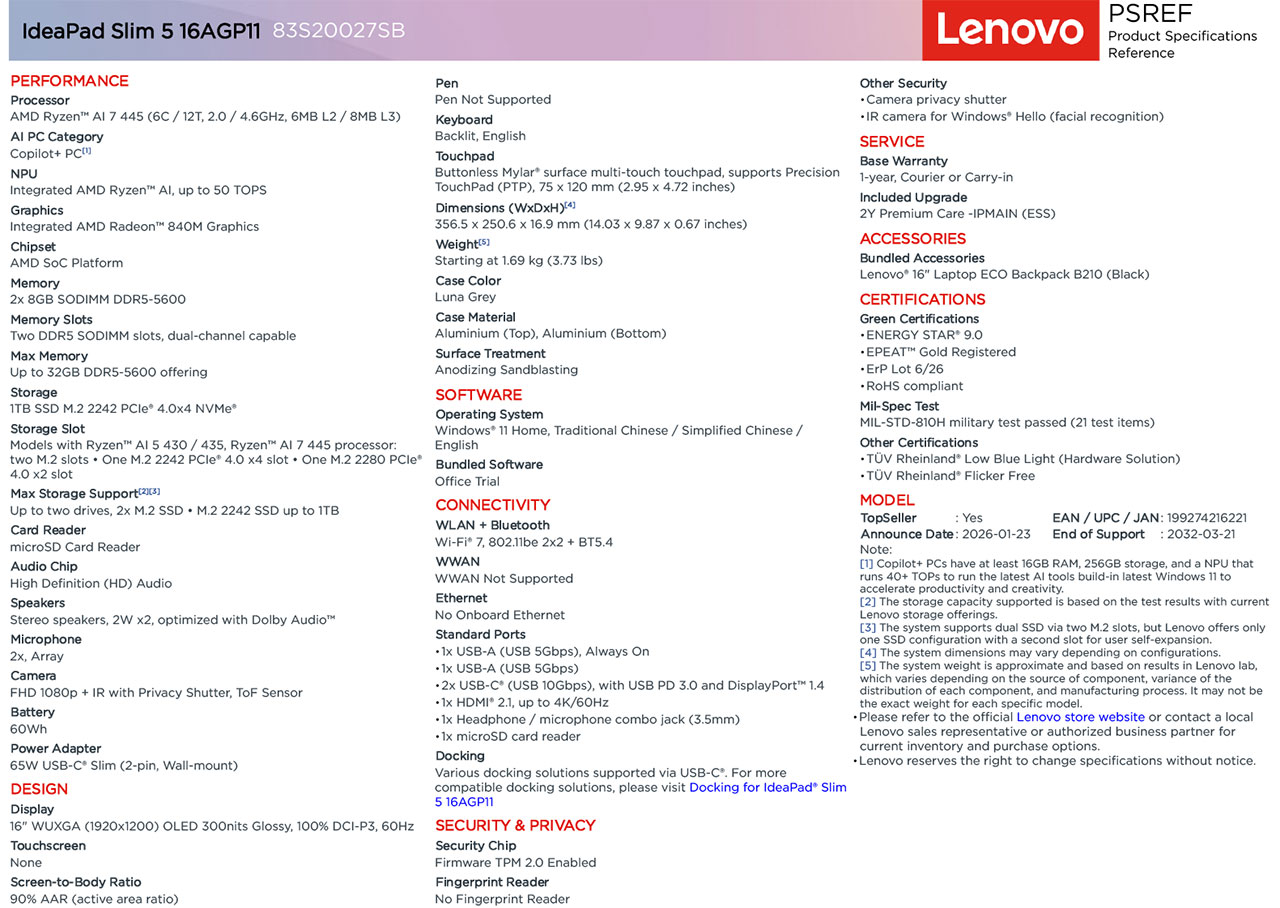 The Lenovo IdeaPad Slim 3 16" Copilot+ PC (model 83S20027SB) is a modern, high-efficiency laptop featuring the AMD Ryzen AI 7 445 processor. This model is part of Lenovo's newest 16:10 aspect ratio lineup, designed specifically for AI-enhanced productivity with a dedicated Neural Processing Unit (NPU) for Copilot+ features.