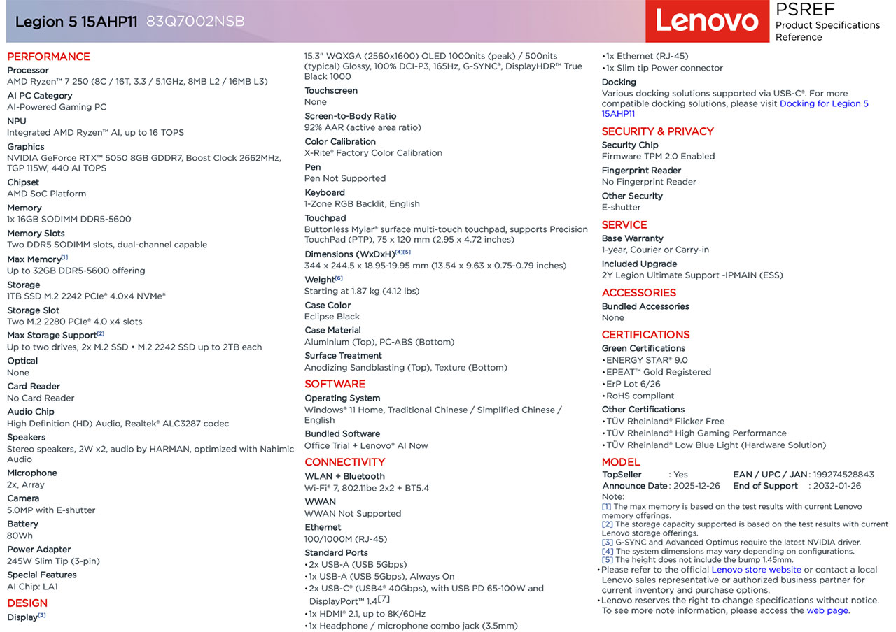 The Lenovo Legion 5a Gen 11 (Model: 83Q7002NSB) is a high-performance 15.3-inch gaming laptop powered by the AMD Ryzen 7 250 processor and NVIDIA GeForce RTX 5060 graphics. This specific configuration is a "Gen 11" model (2025/2026 release) that distinguishes itself with a compact 15.3-inch chassis and a premium OLED display.
