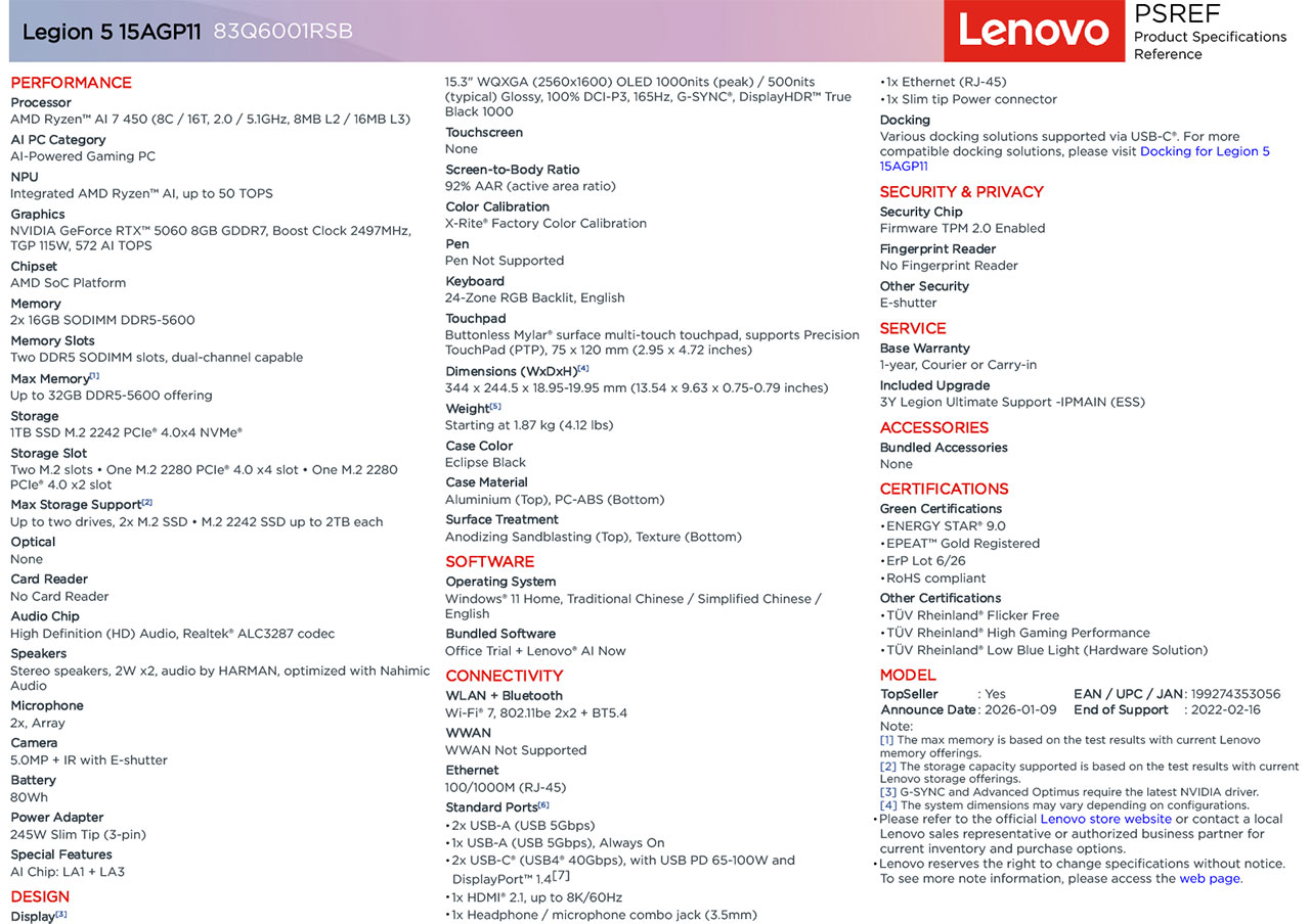The Lenovo Legion 5 (15.3", Gen 10) 83Q6001RSB is a high-performance gaming laptop equipped with the latest AMD Ryzen AI 7 450 processor and an NVIDIA GeForce RTX 5060 GPU. Featuring a unique 15.3-inch display and advanced AI-driven performance optimization.