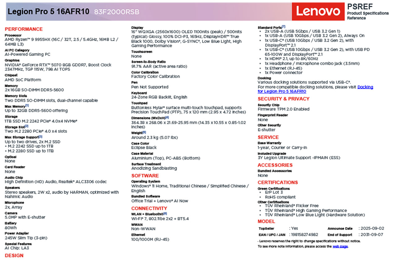 LENOVO LEGION PRO 5 16" RYZEN 9 9955HX 83F2000RSB
