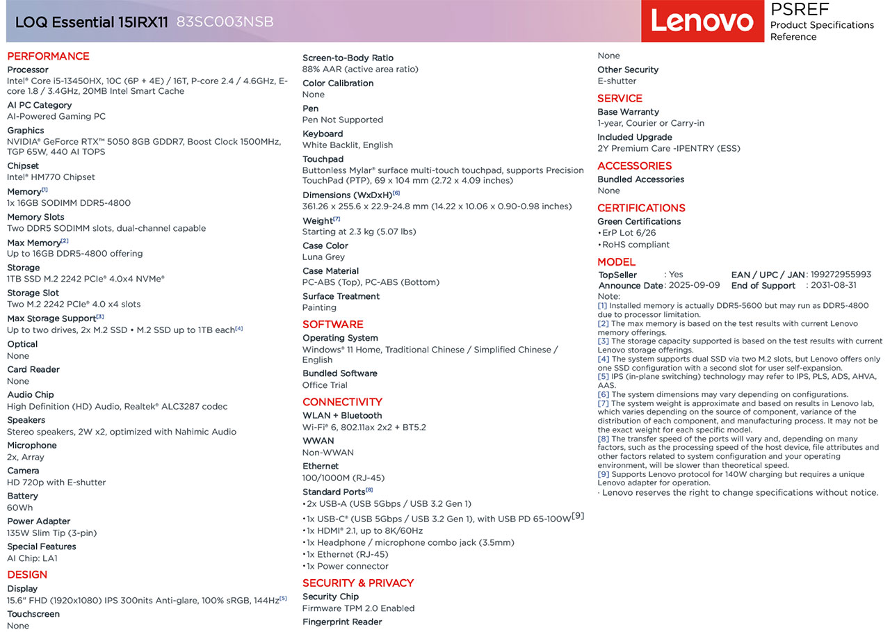 LENOVO LOQ ESSENTIAL 15.6" I5-13450HX 83SC003NSB