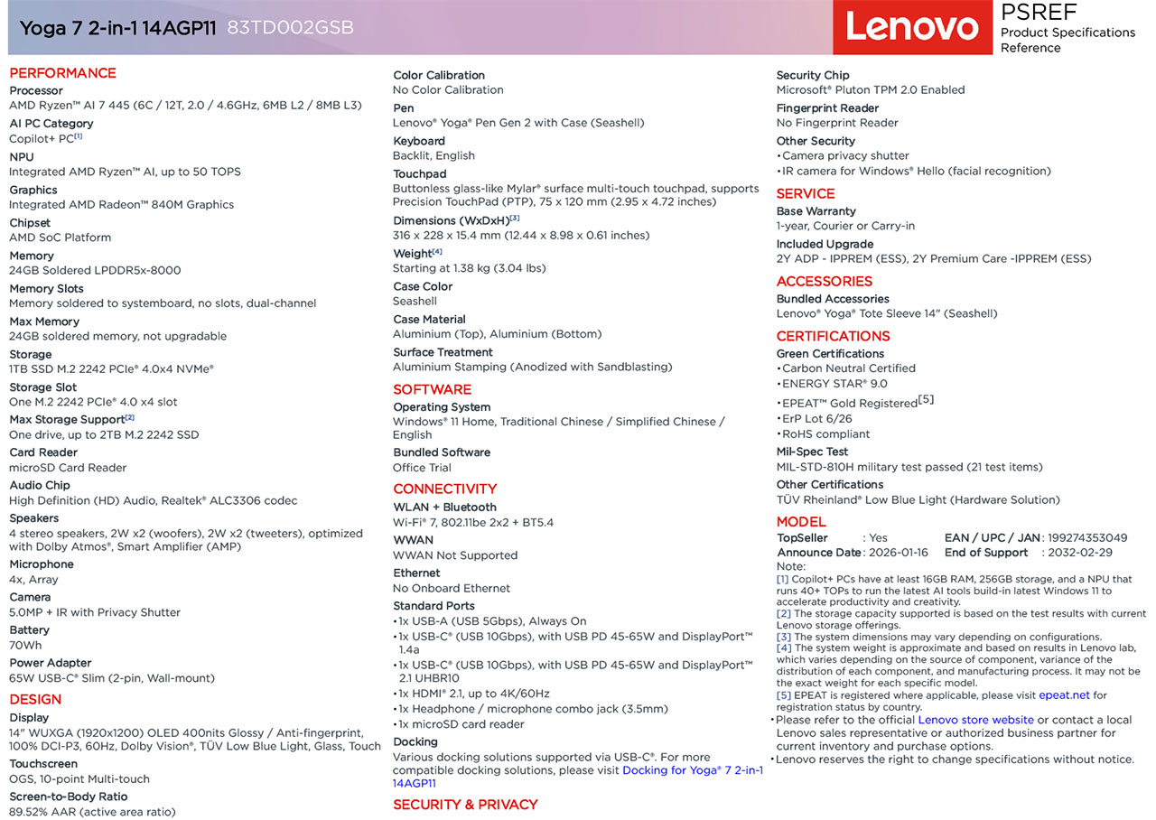 The Lenovo Yoga 7 2-in-1 14" (83TD002GSB) is a "Copilot+ PC" that features the latest AMD Ryzen AI 7 445 processor with a powerful 50 TOPS NPU for on-device AI tasks. This specific configuration is built for high-performance multitasking with a premium 14-inch OLED display.