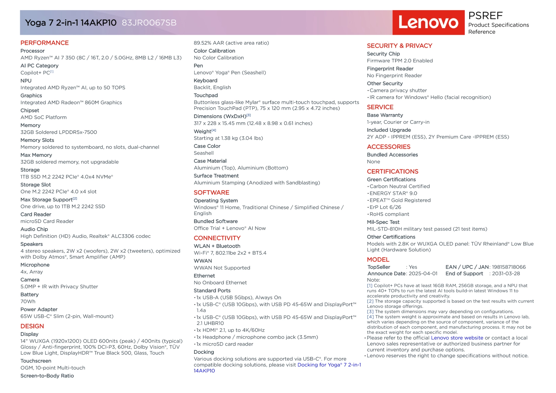 - Processor: AMD Ryzen AI 7 350 (8C/16T, 2.0/5.0GHz, 8MB L2/16MB L3)