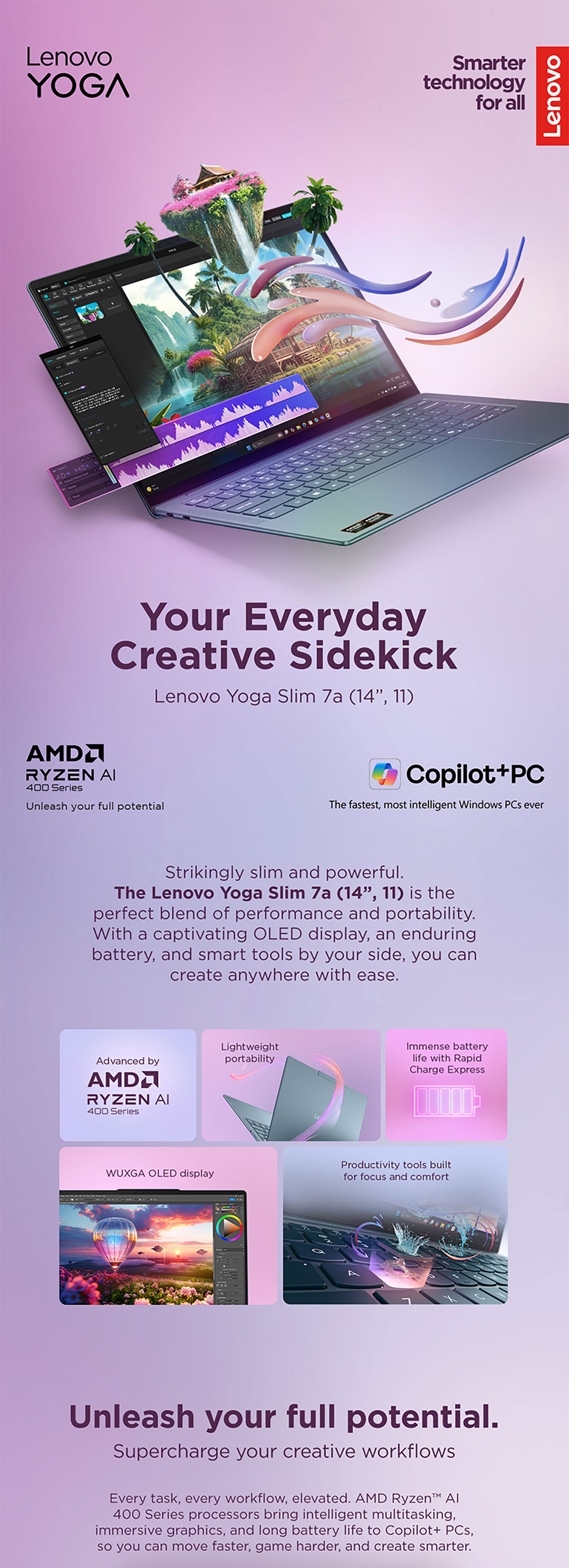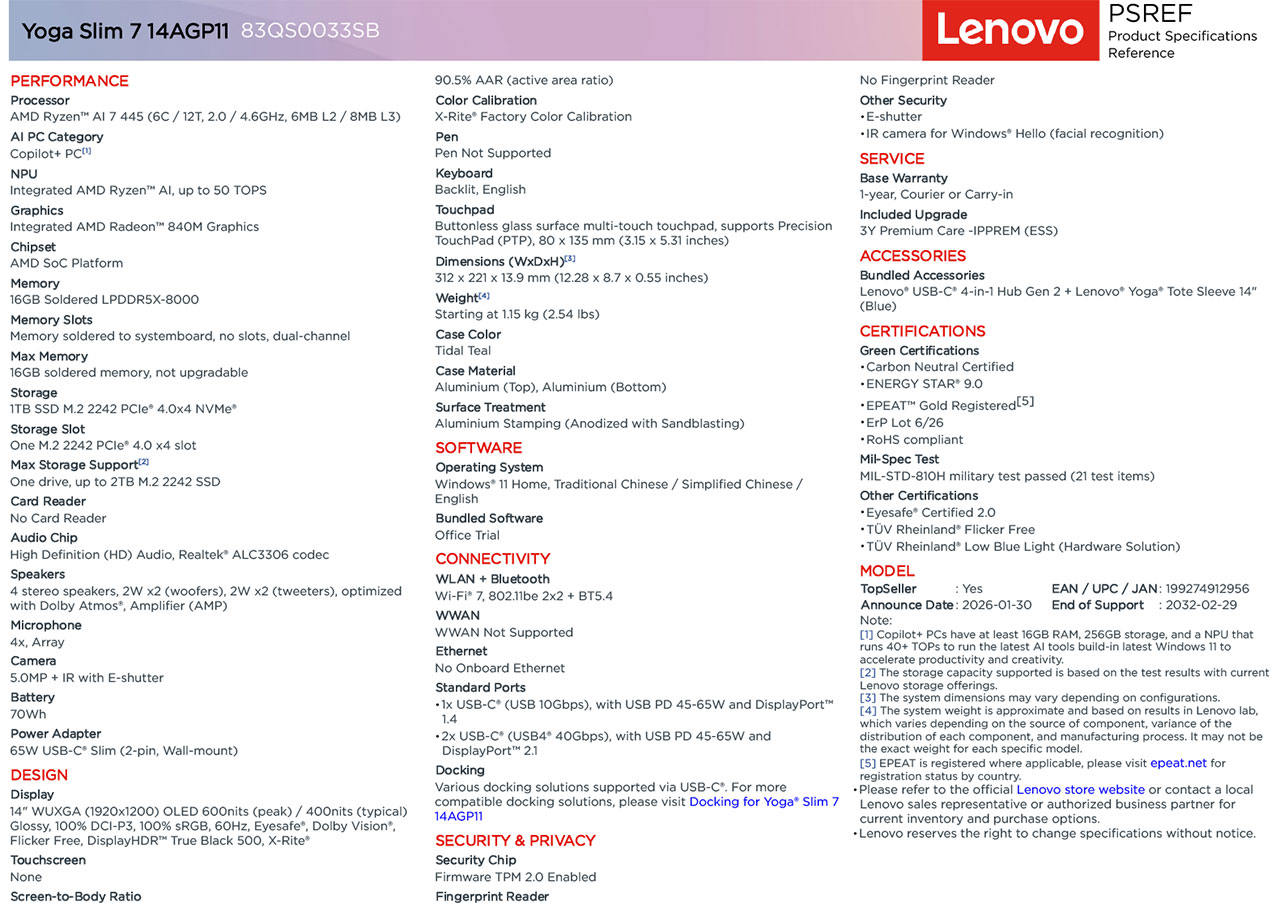 The Lenovo Yoga Slim 7 (14", Gen 11) with model number 83QS0033SB is a highly portable Copilot+ PC specifically designed for creative professionals and mobile productivity.