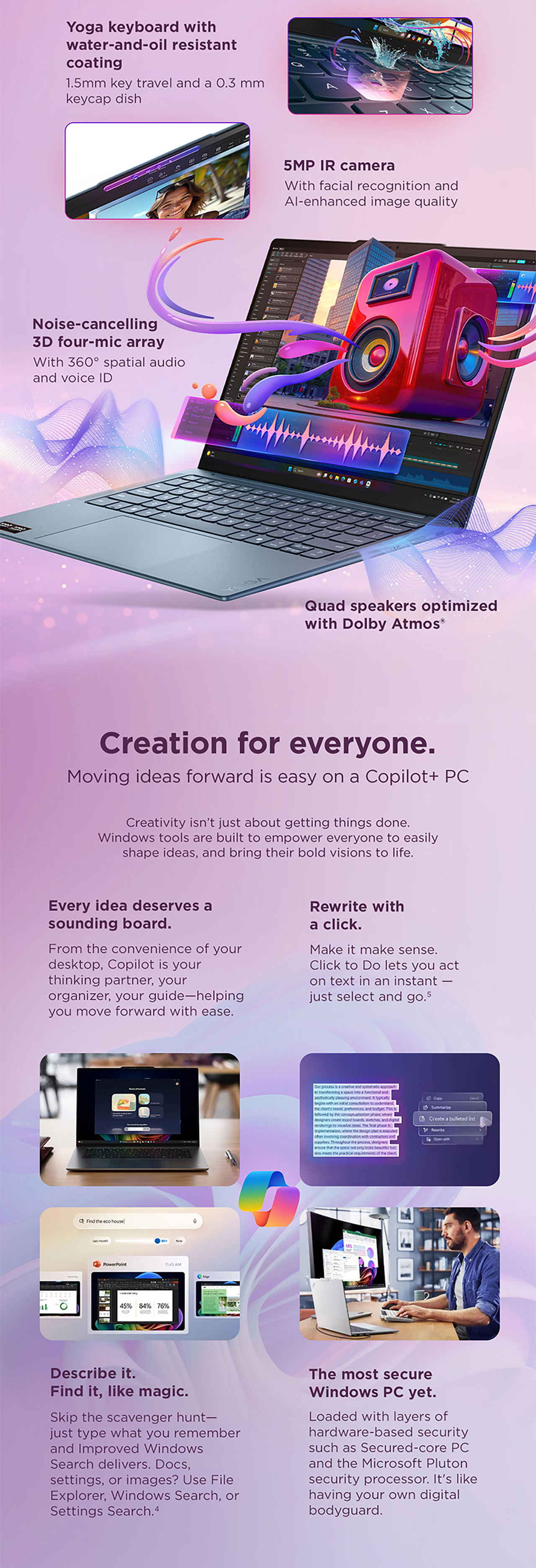 - Audio: 4-speaker system (2x 2W woofers, 2x 2W tweeters) optimized with Dolby Atmos®