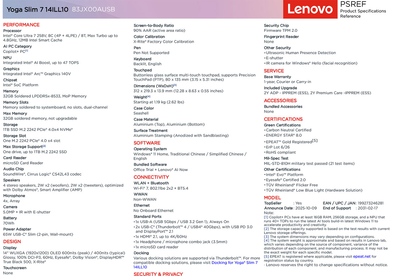 LENOVO YOGA SLIM 7 14" COPILOT+ PC ULTRA 7 258V 83JX00AUSB