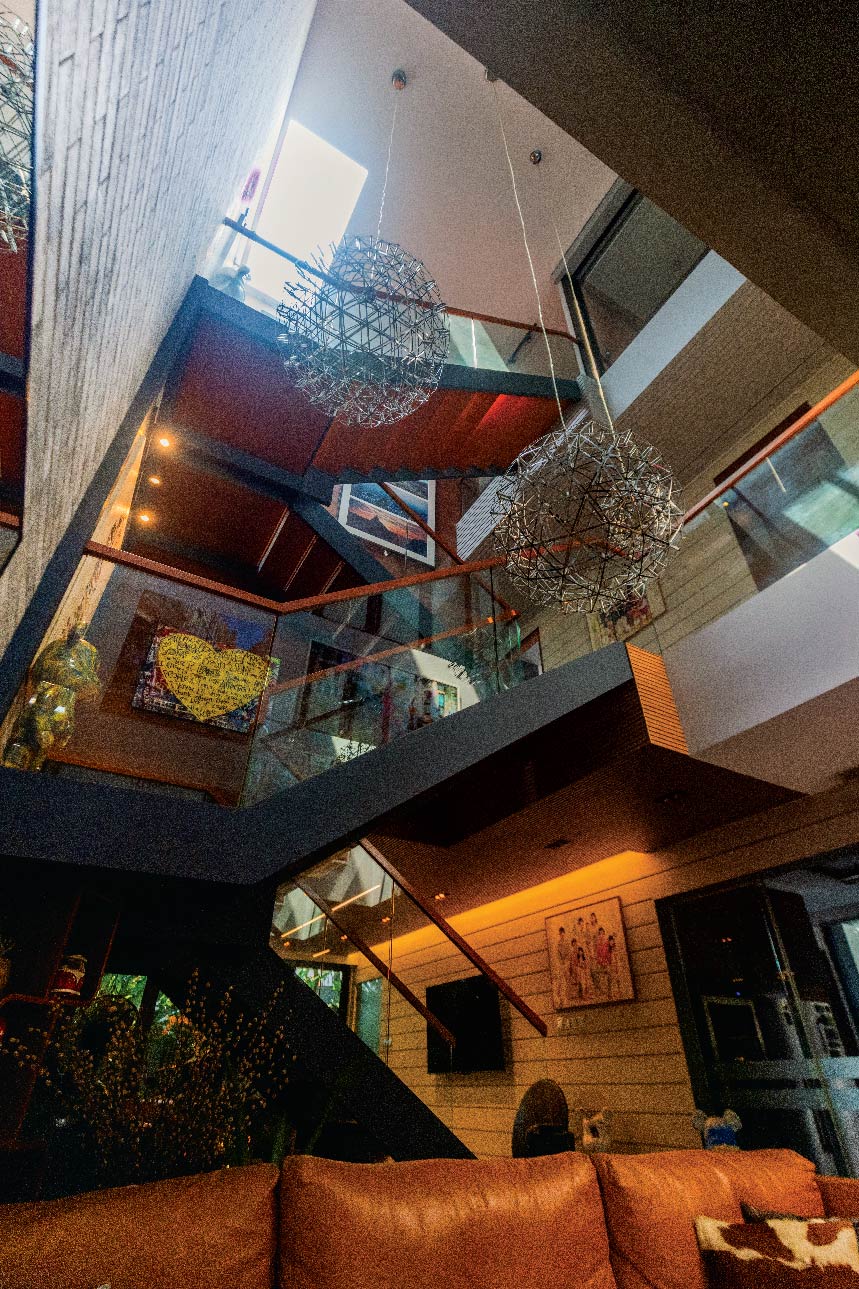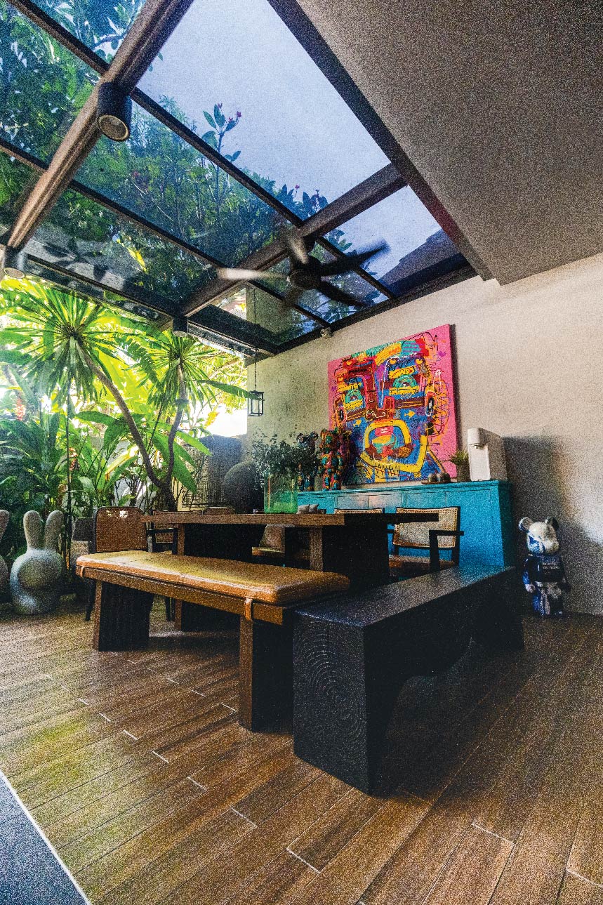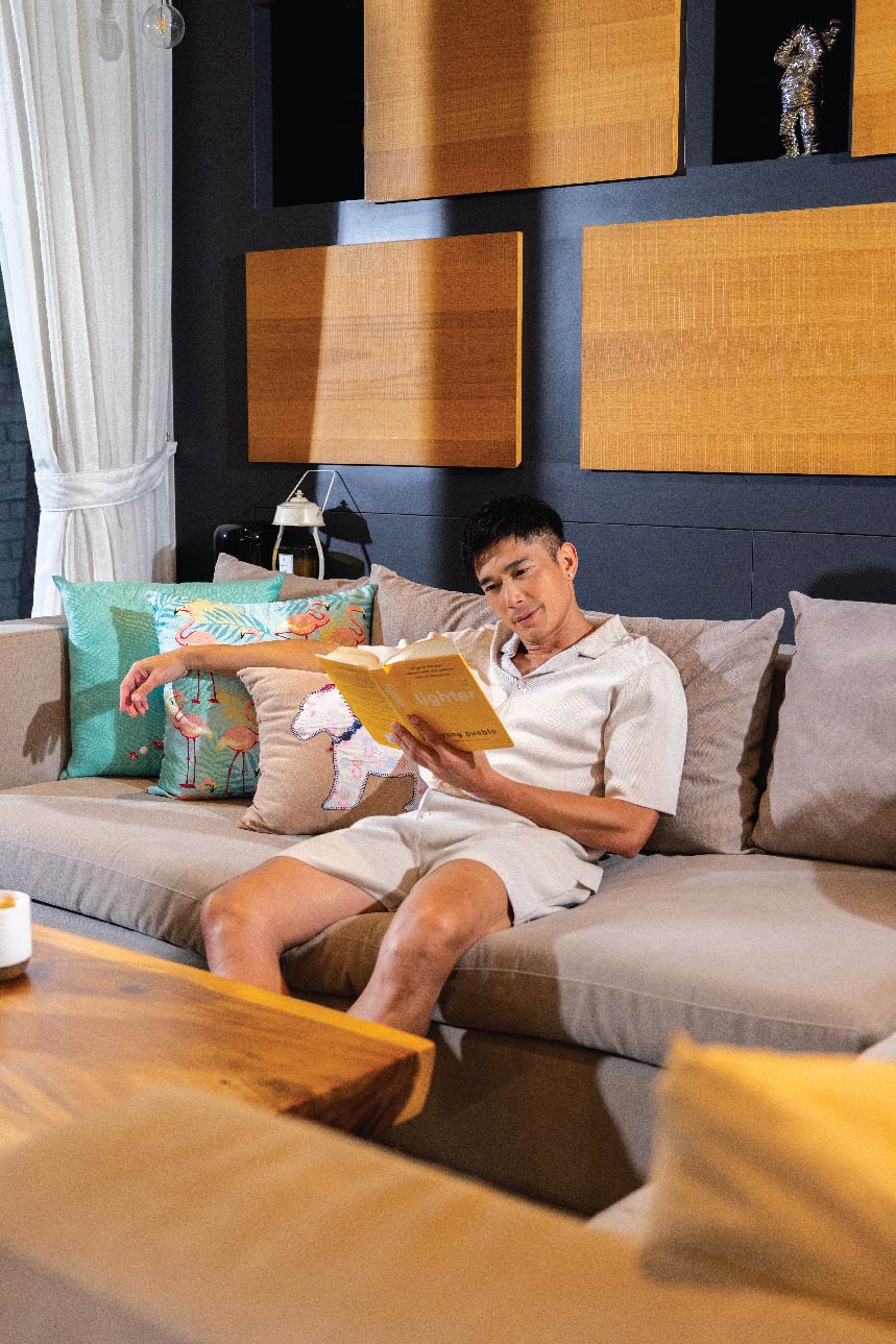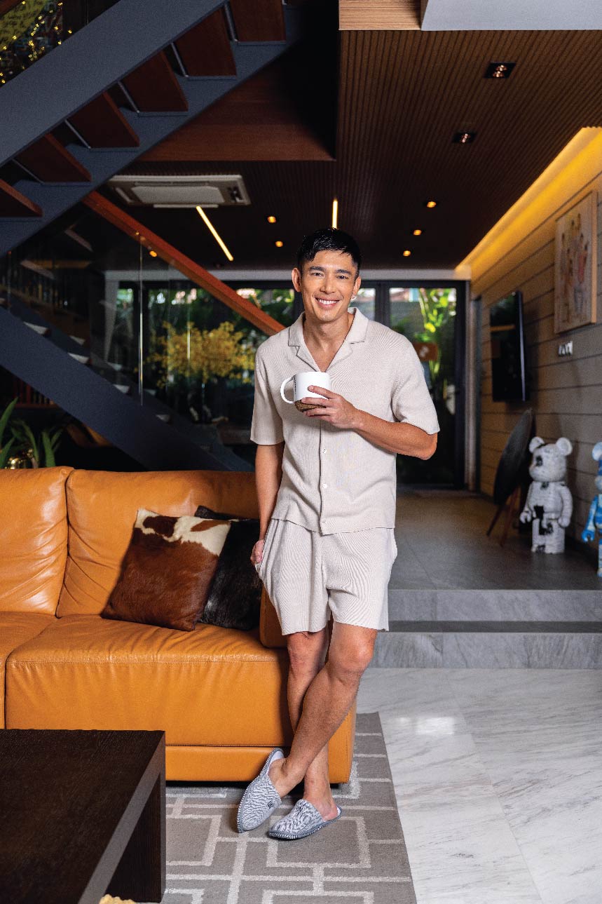 At the same time, the house reflects his own growth. Once more guarded, Elvin now embraces openness — in both character and design. From its central airwell to its openconcept social areas, the layout mirrors his belief in staying connected yet free, polished yet real. Even his art collection follows this philosophy: instead of lavish purchases, he gravitates towards pieces picked up in places like Bangkok and Bali — bold, story-driven works such as the tribal-inspired paintings and playful sculptures seen around his home. For him, the home is both a sanctuary for loved ones and a reflection of his belief in living openly and authentically.