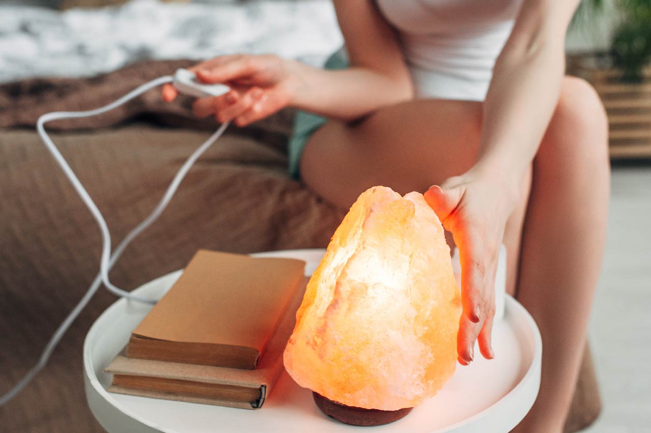 Aromatherapy lamps, such as Himalayan salt lamps that also serve as bedside lighting create a spa-like atmosphere at home.