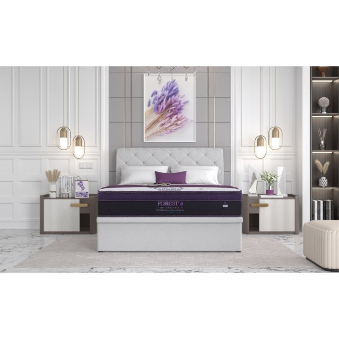 Experience the ultimate in sleep luxury with the Maxcoil Mattress Forrest Amethyst VI - K. Featuring individual barrel pocketed springs, amethyst infusion, and a double pillow top, this mattress is designed to provide unparalleled comfort and support for a restful night's sleep.