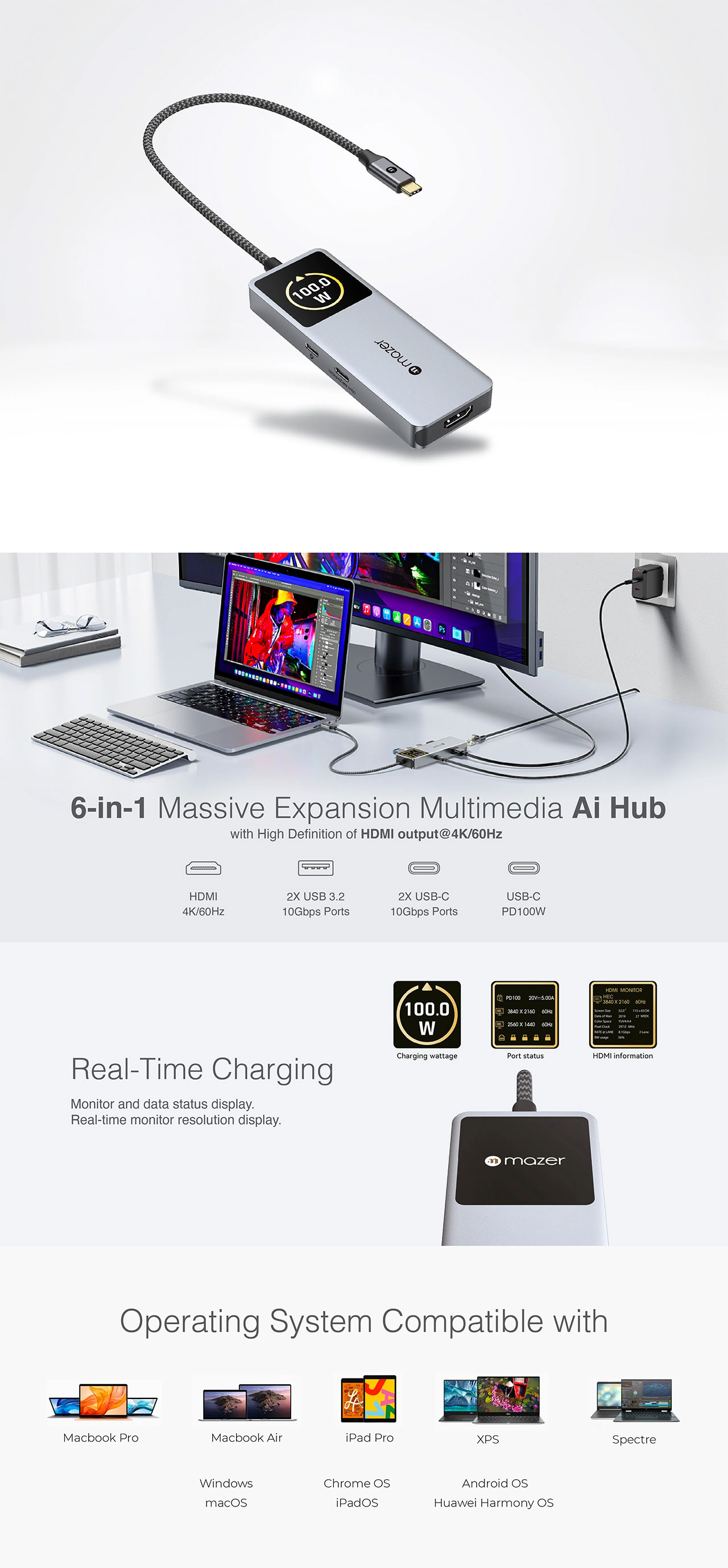 MAZER 100W 6-IN-1 INFINITEHUB AI USB-C HUB W/SMART DISPLAY M-AI-HUB71-GY