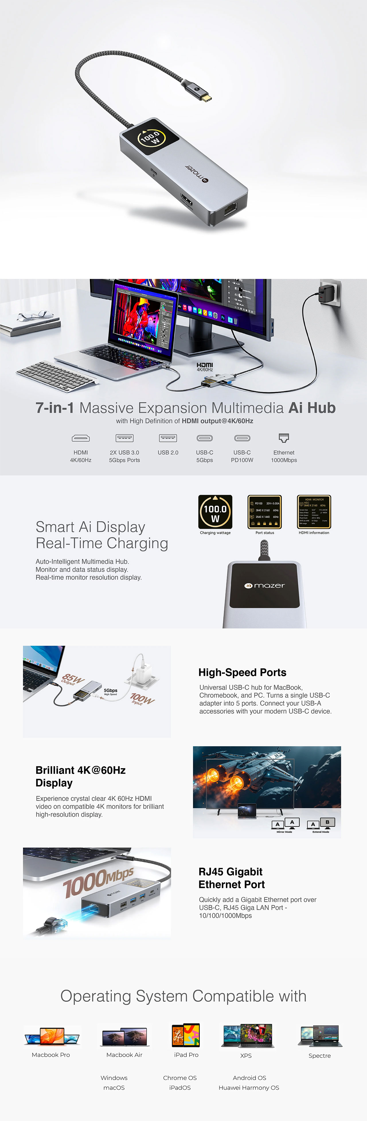 MAZER 100W 7-IN-1 INFINITEHUB AI USB-C HUB W/SMART DISPLAY M-AI-HUB72-GY