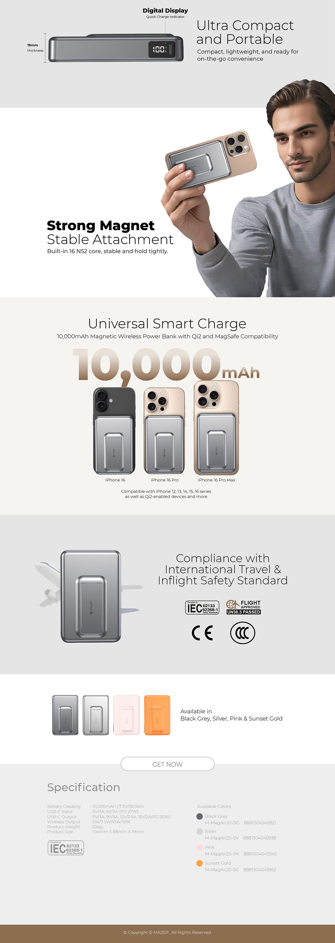 MAZER 30W MAGAIR20 10000MAH WIRELESS MAGNETIC POWERBANK (CCC CERTIFIED) - BLACK GREY M-MAGAIR20-BG