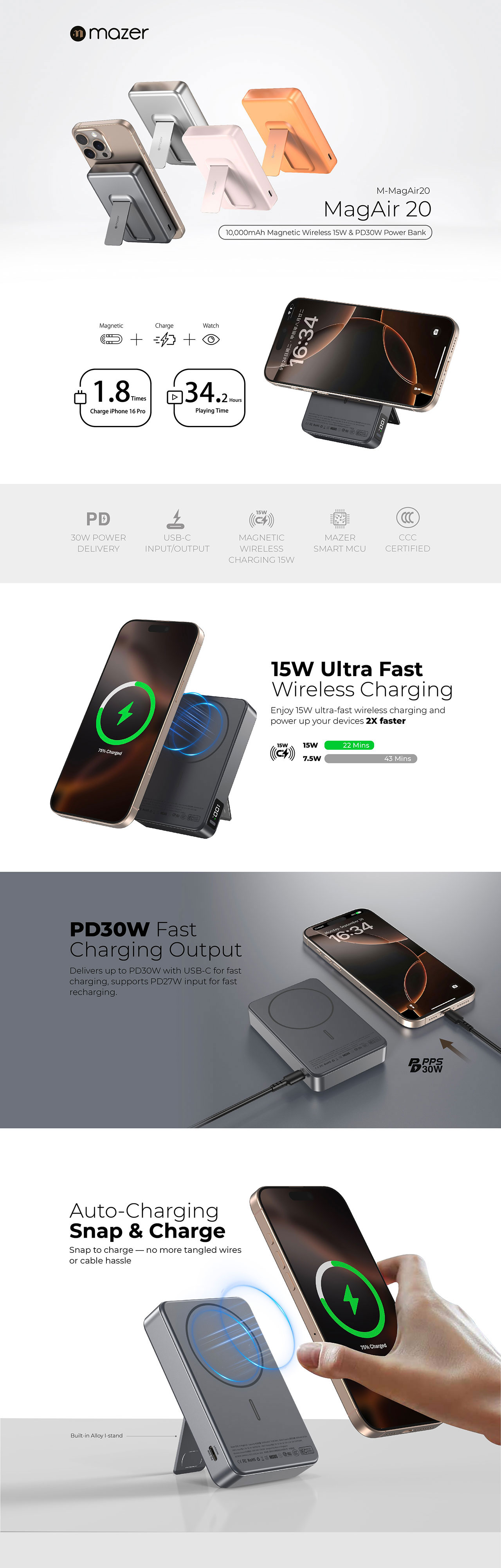 MAZER 30W MAGAIR20 10000MAH WIRELESS MAGNETIC POWERBANK (CCC CERTIFIED) - PINK M-MAGAIR20-PK