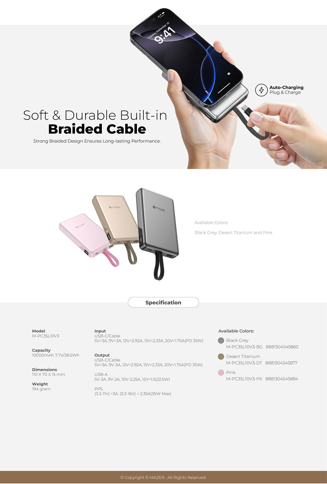 MAZER 35W POWERCHARGE LINK 10000MAH POWERBANK W/CABLES (CCC CERTIFIED) - BLACK GREY M-PC35L10V3-BG
