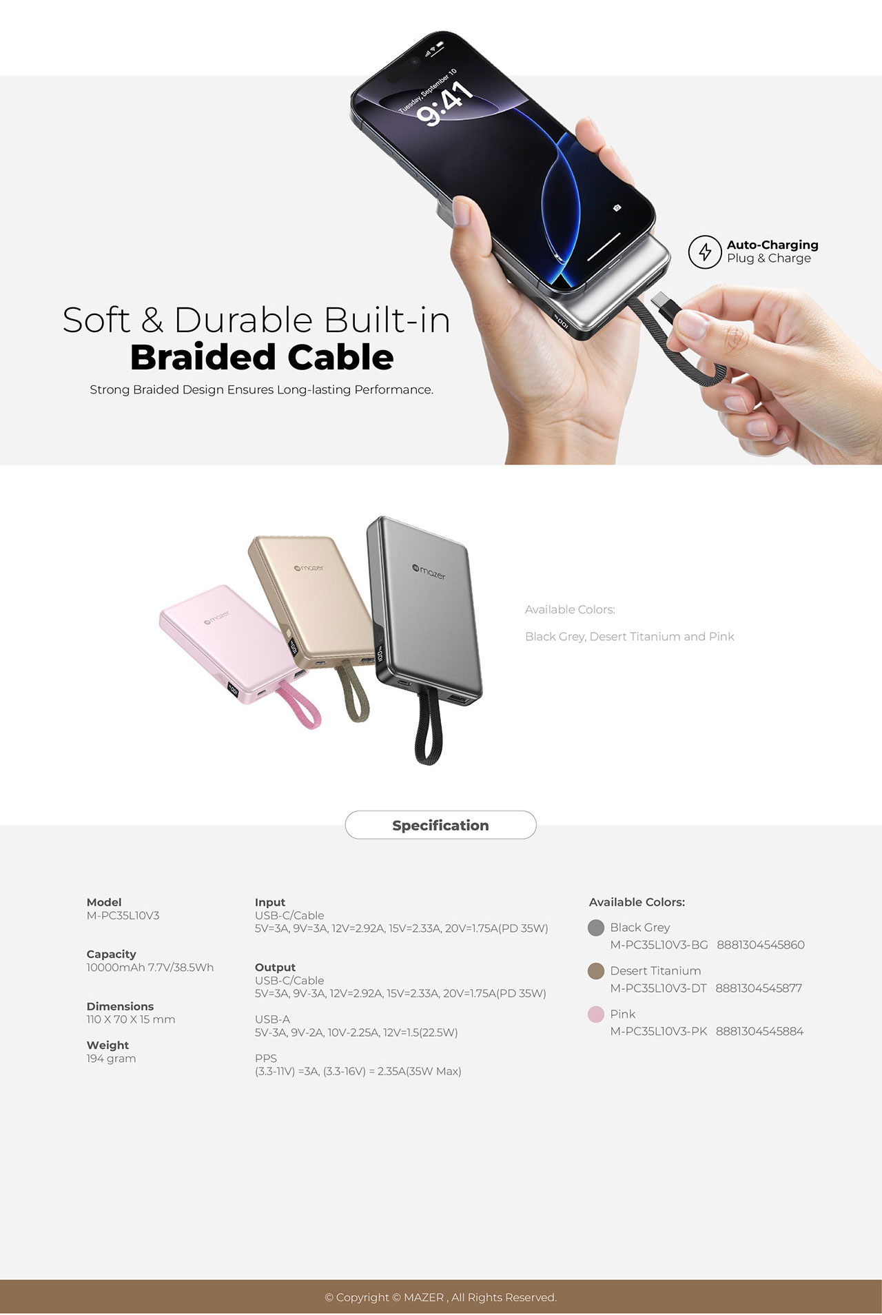 MAZER 35W POWERCHARGE LINK 10000MAH POWERBANK W/CABLES (CCC CERTIFIED) - DESERT TITANIUM M-PC35L10V3-DT