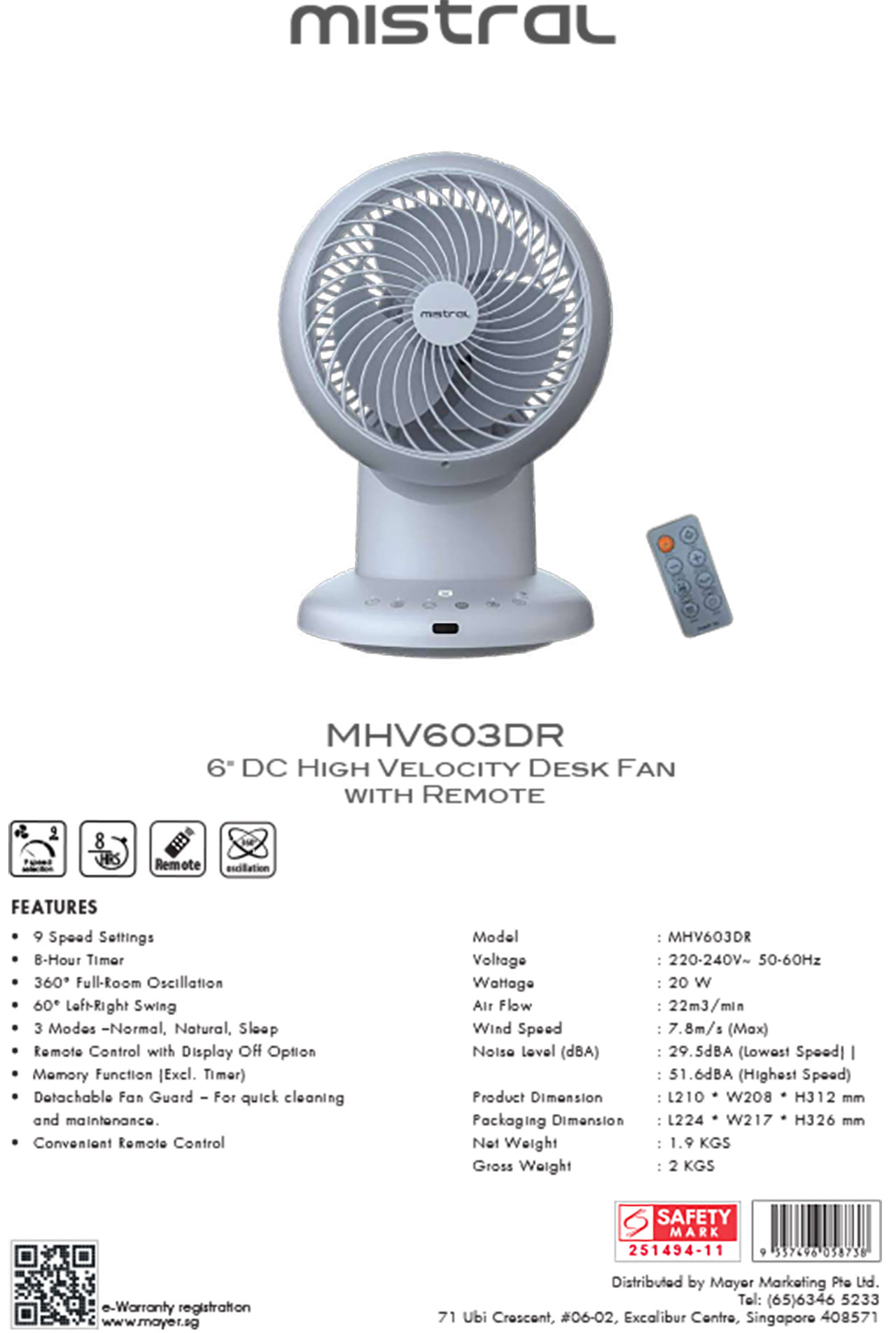 MISTRAL 6" HIGH VELOCITY DC DESK FAN MHV603DR