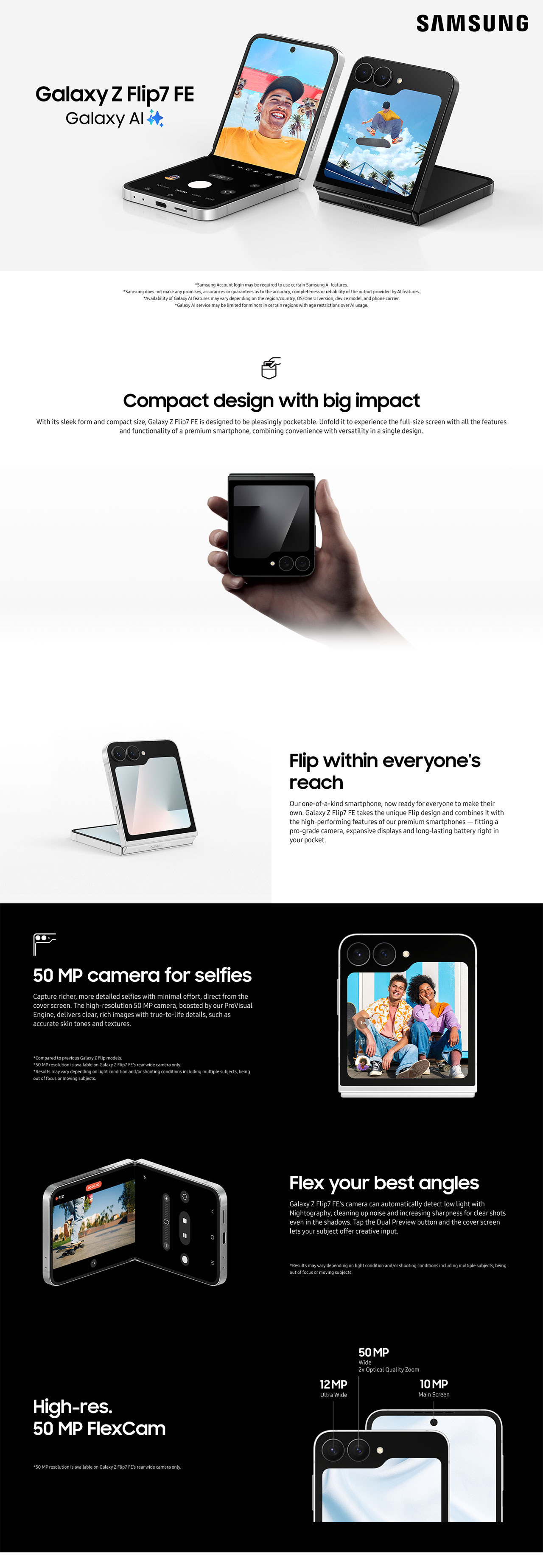 The Samsung Galaxy Z Flip7 FE is ideal for tech enthusiasts who value innovation, convenience, and portability. It's perfect for those who love capturing high-quality selfies and photos with its advanced camera system, and for users who appreciate a sleek, foldable design that fits easily into any pocket or bag.