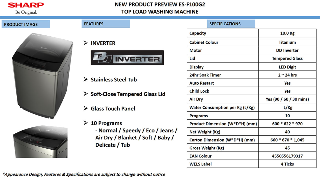 The Sharp Top Load Washer ES-F100G2 combines style and functionality with its sleek design and advanced features. With a 10kg capacity, it handles large loads effortlessly, while the stainless steel tub and soft-close lid ensure durability and safety. Perfect for modern households, it offers multiple wash programs for versatile cleaning.