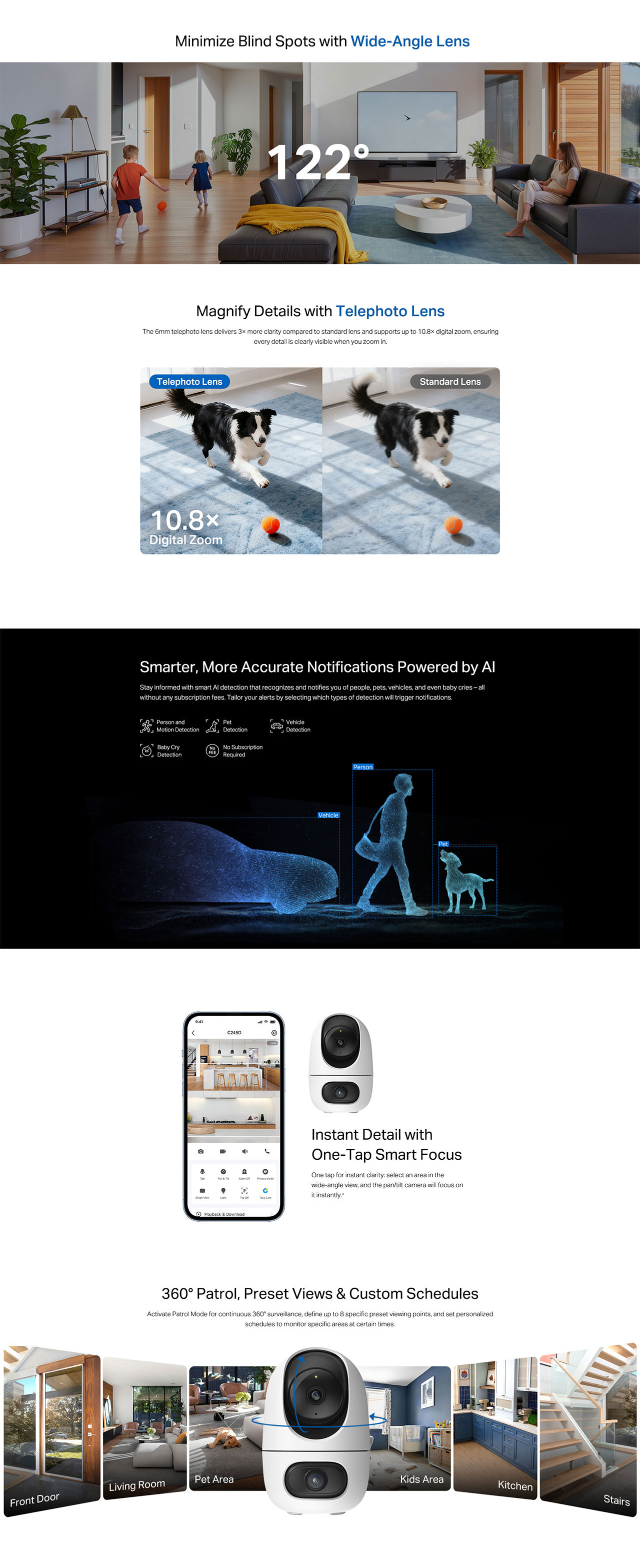 - Wide-angle & Telephoto Lens - With 122° FOV wide-angle lens and 6mm telephoto lens, it ensures all-around awareness and down-to-the-detail protection of your home.