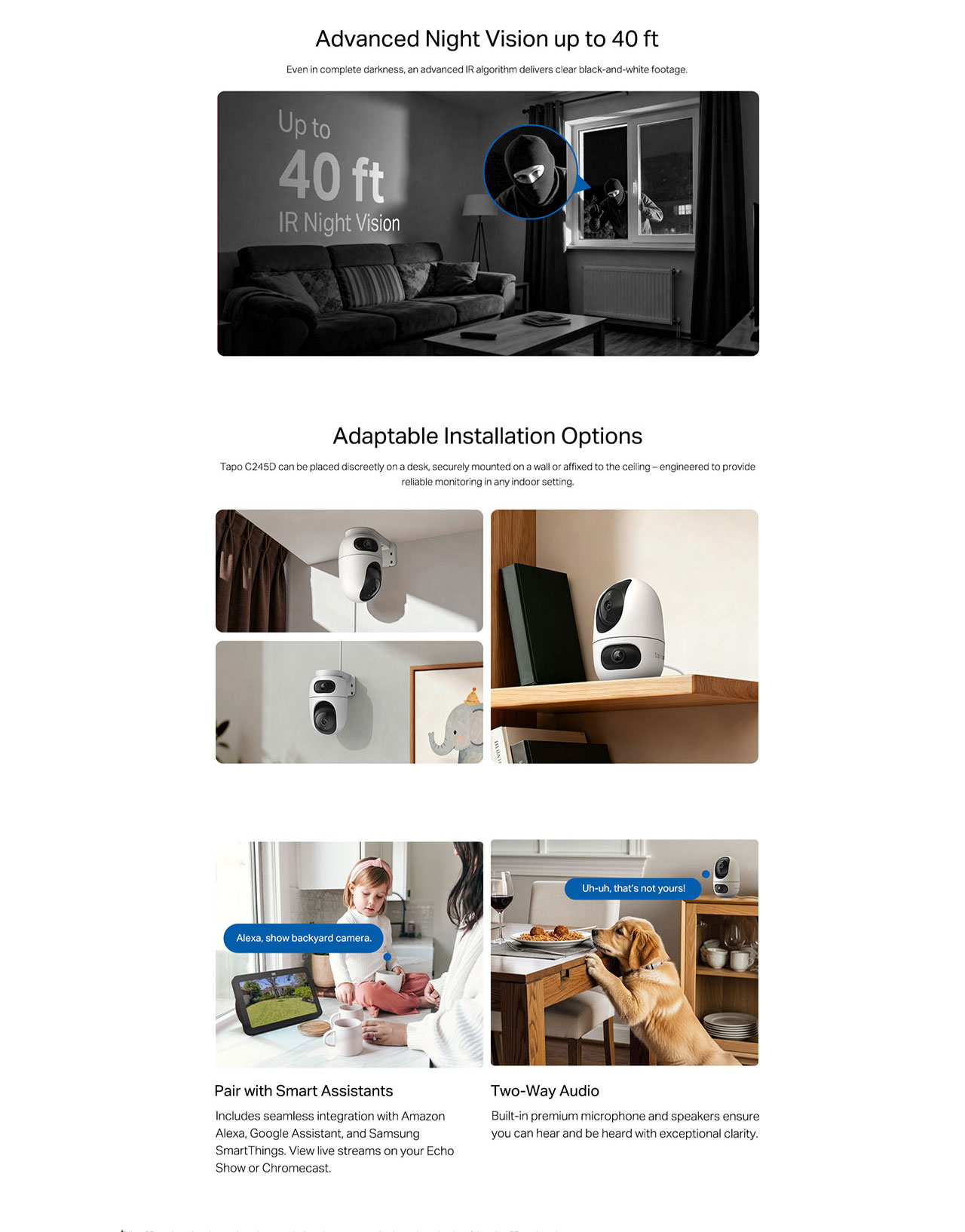 - Works with Alexa, Google Home & Samsung SmartThings - Fully compatible with Amazon Alexa and Google Assistant, use your simple voice command to view Tapo indoor/outdoor home security wi-fi camera live stream.
