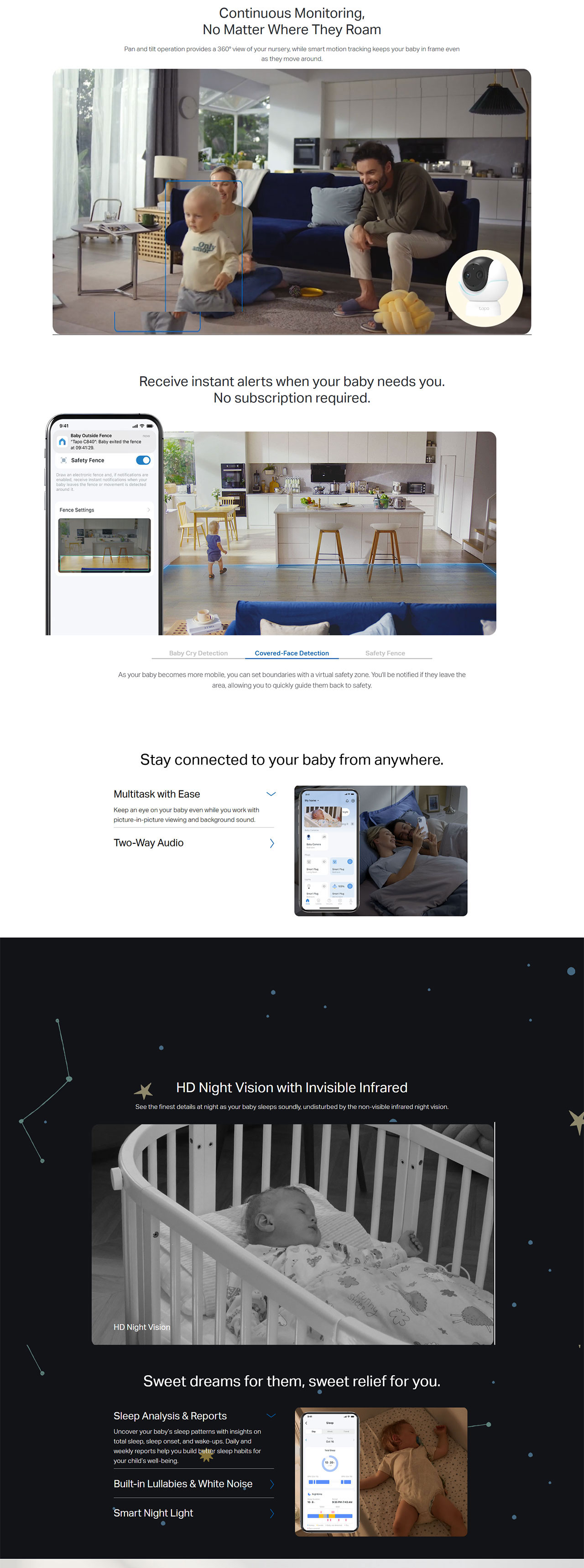 - Instant Notifications - Receive notifications when your baby is awake, fussy face-covered, or rolled over.